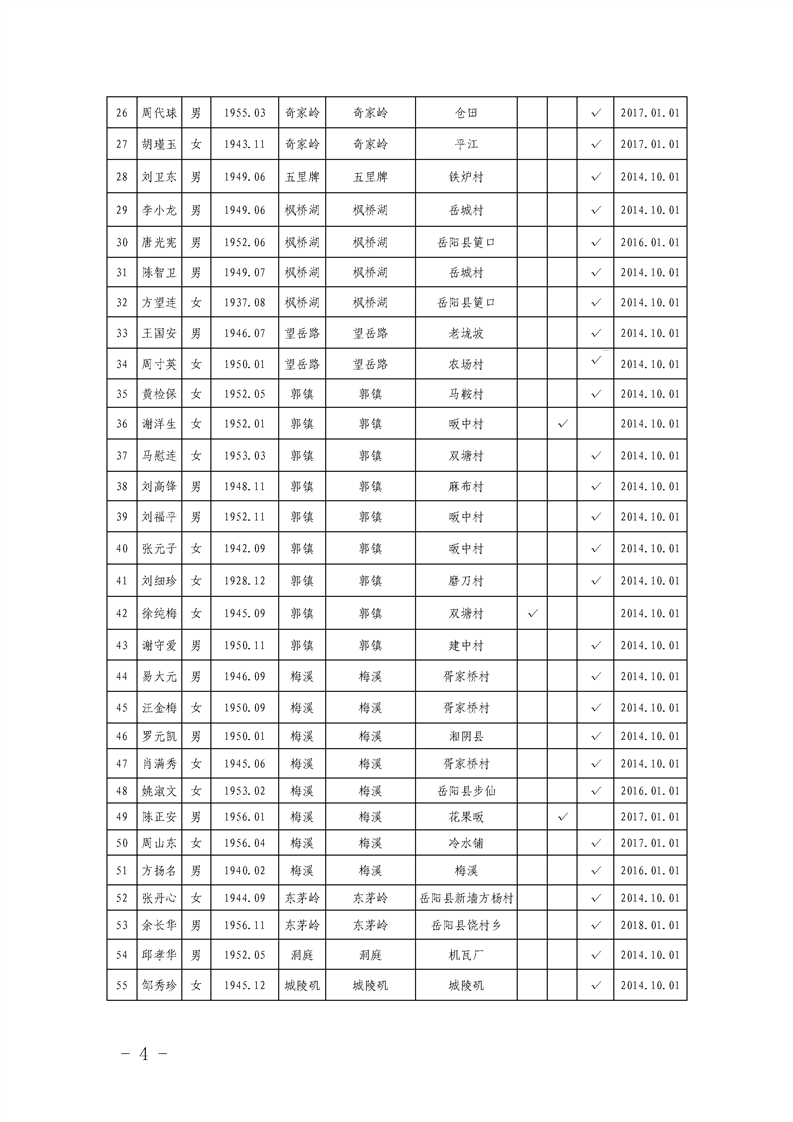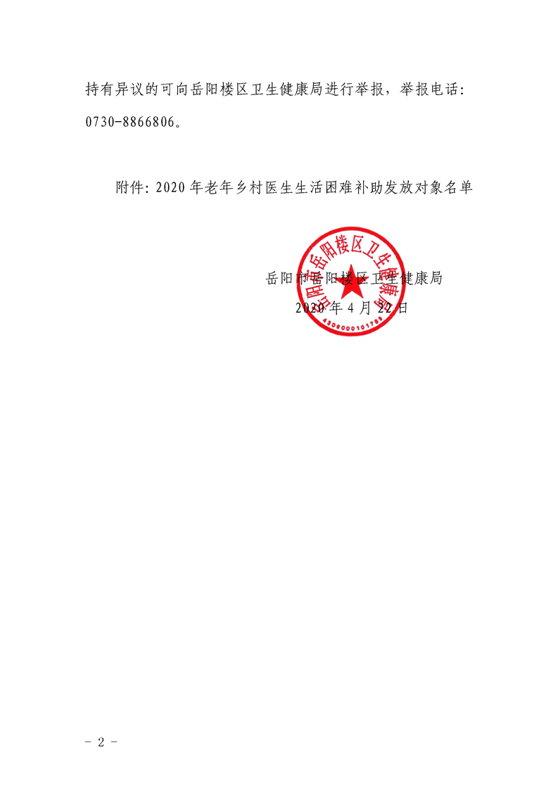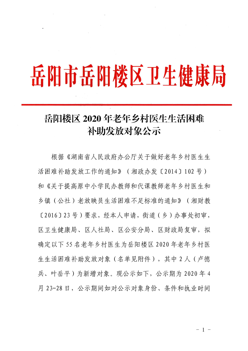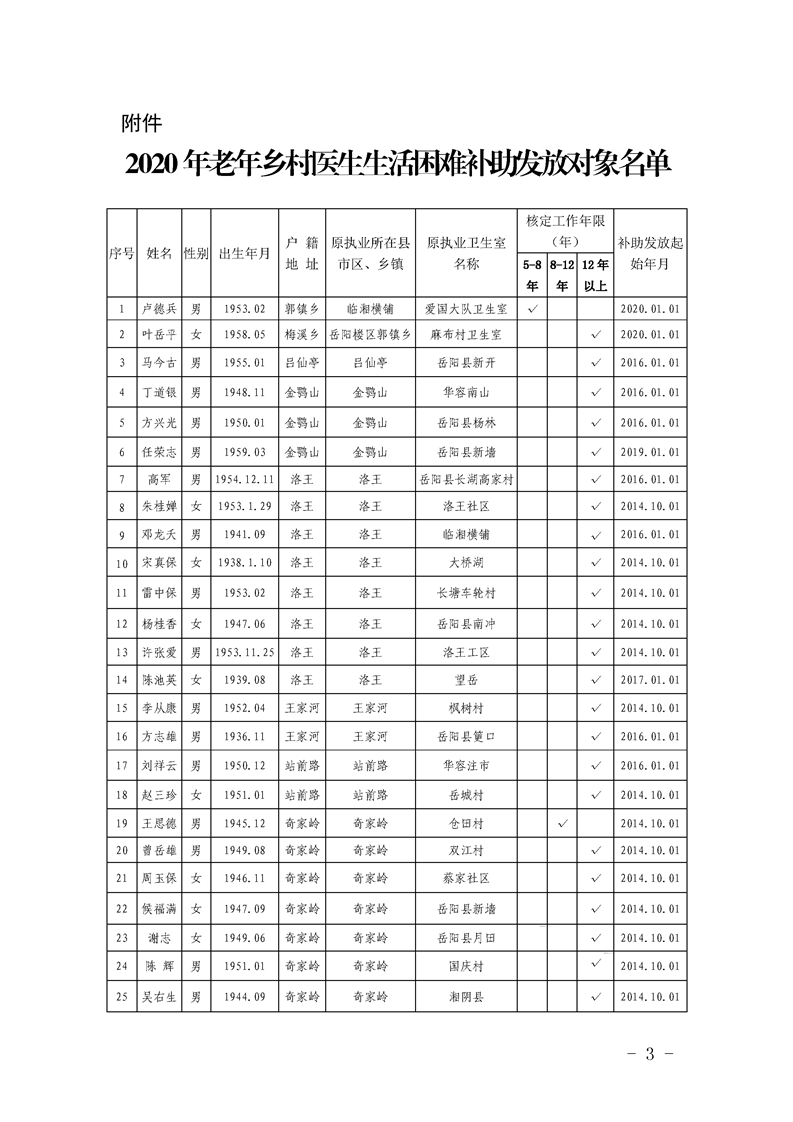 岳阳楼区2020年老年乡村医生生活困难补助发放对象公示