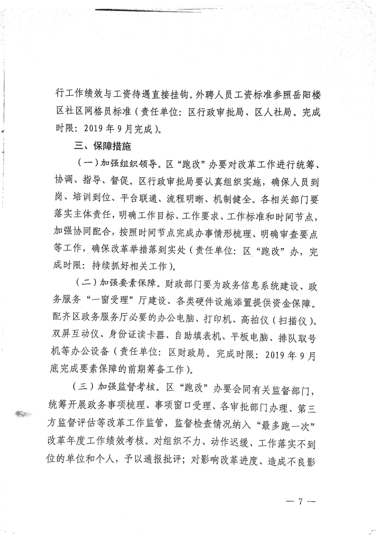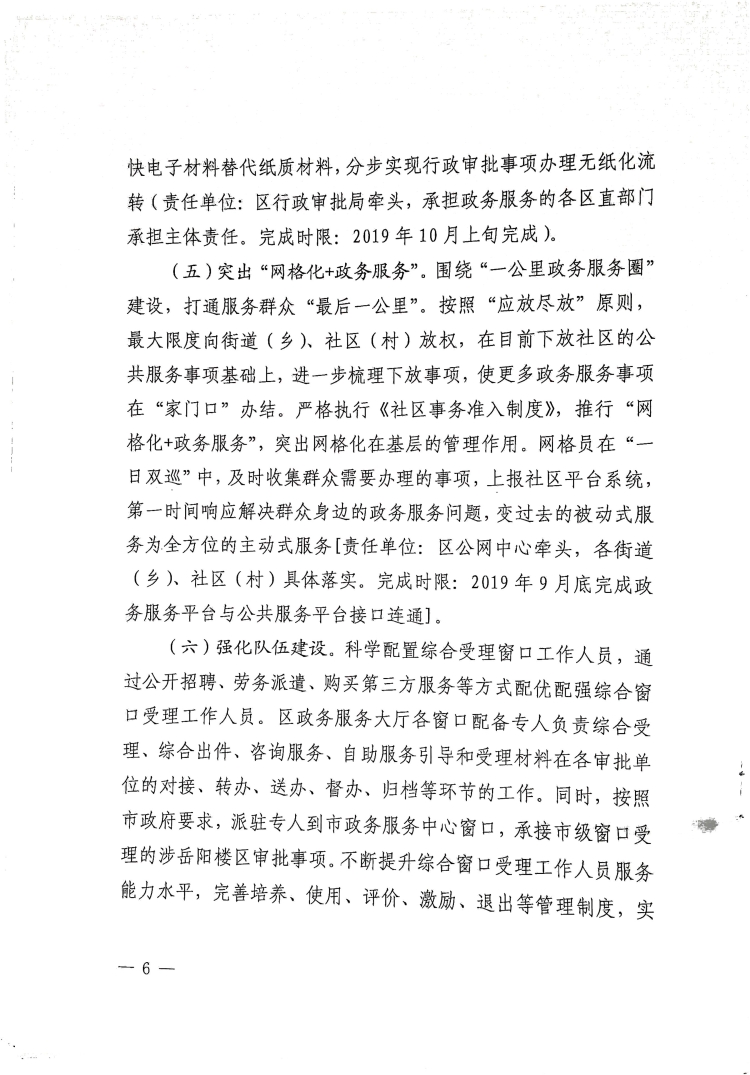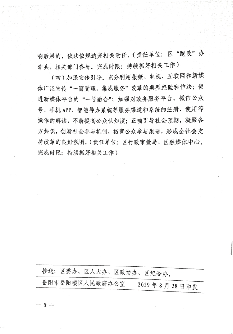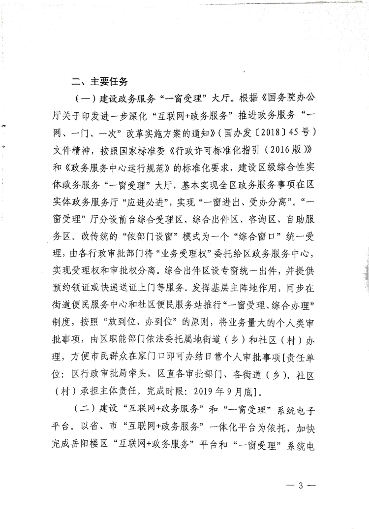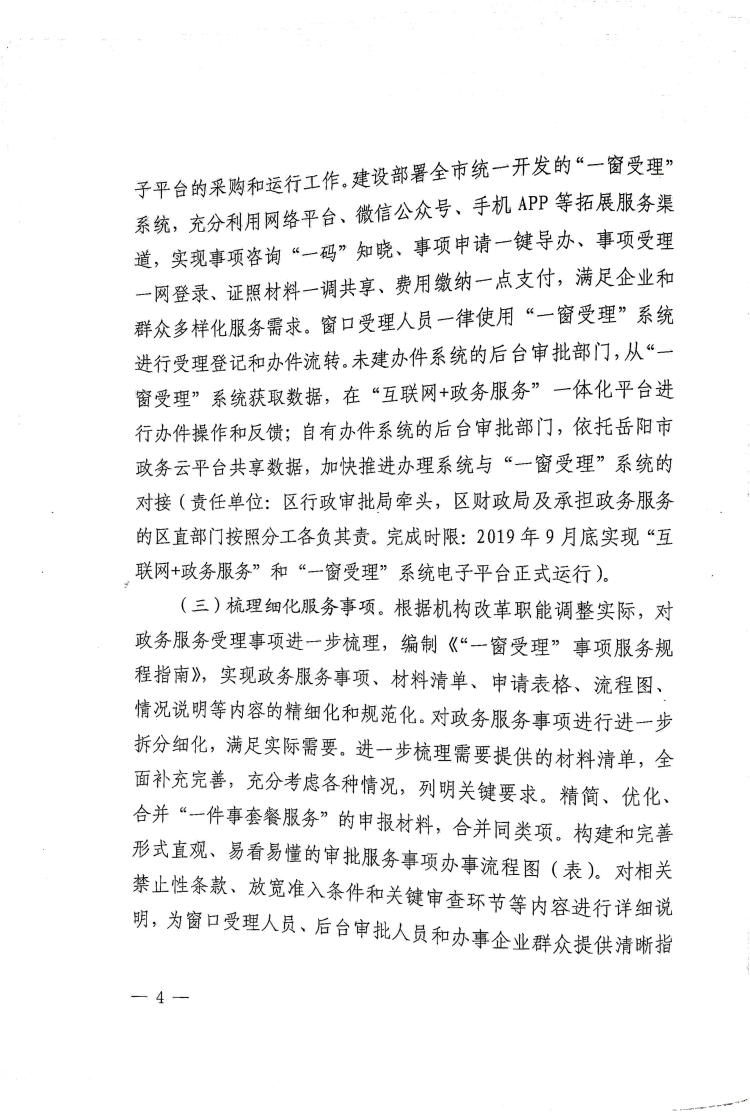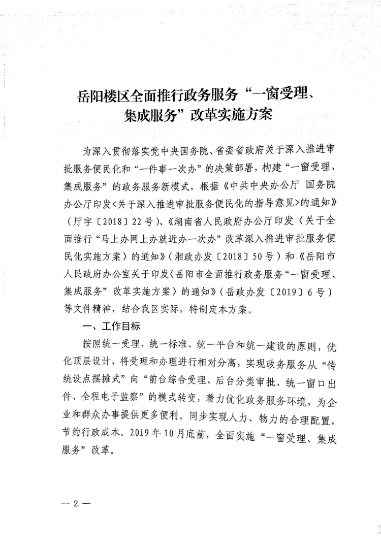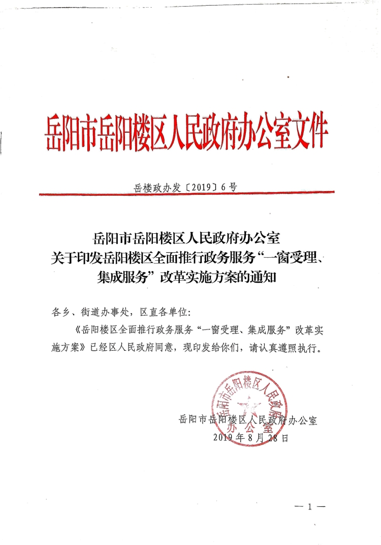 关于印发岳阳楼区全面推行政务服务“一窗受理、集成服务”改革实施方案的通知