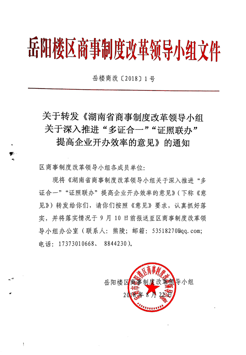 关于转发《湖南省商事制度改革领导小组关于深入推进“多证合一”“证照联办”提高企业开办效率的意见》的通知