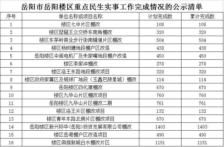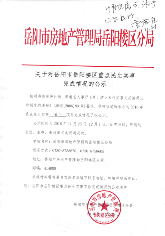 岳阳楼区房产分局2016年重点民生实事项目完成情况公示