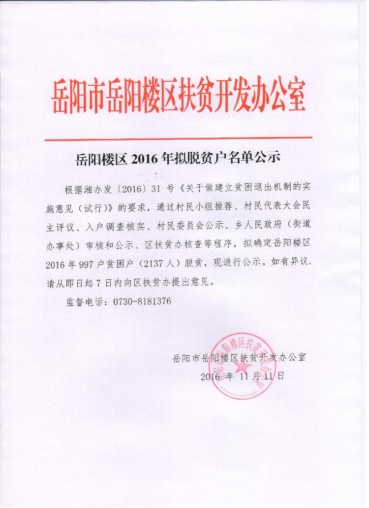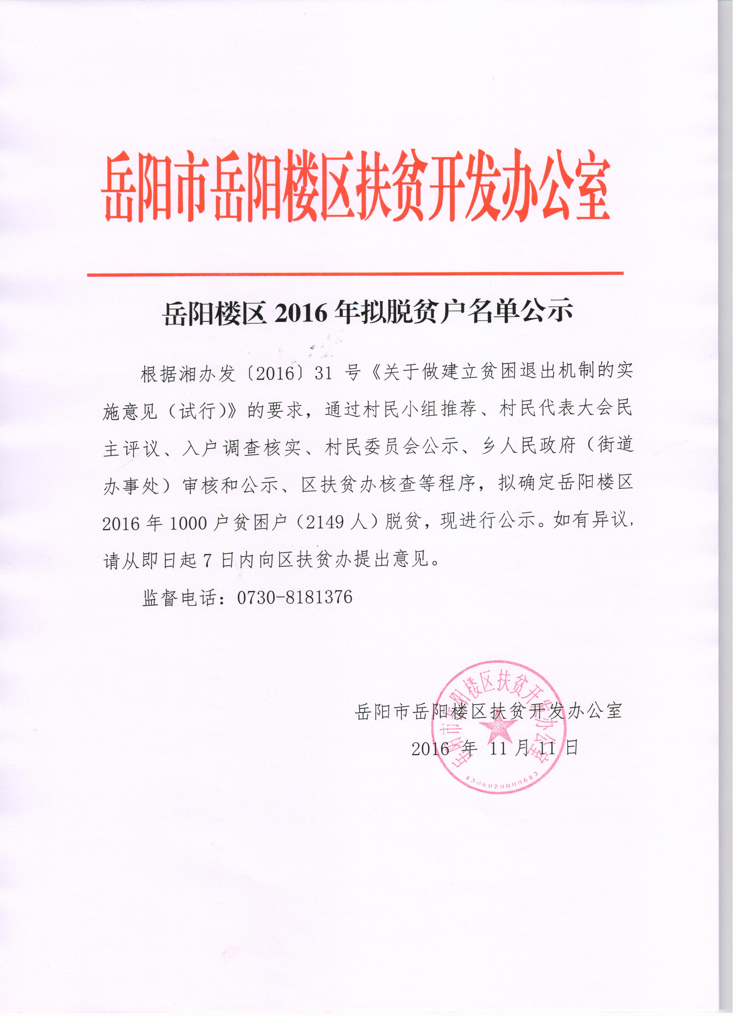 岳阳楼区2016年度拟脱贫户人员名单公示