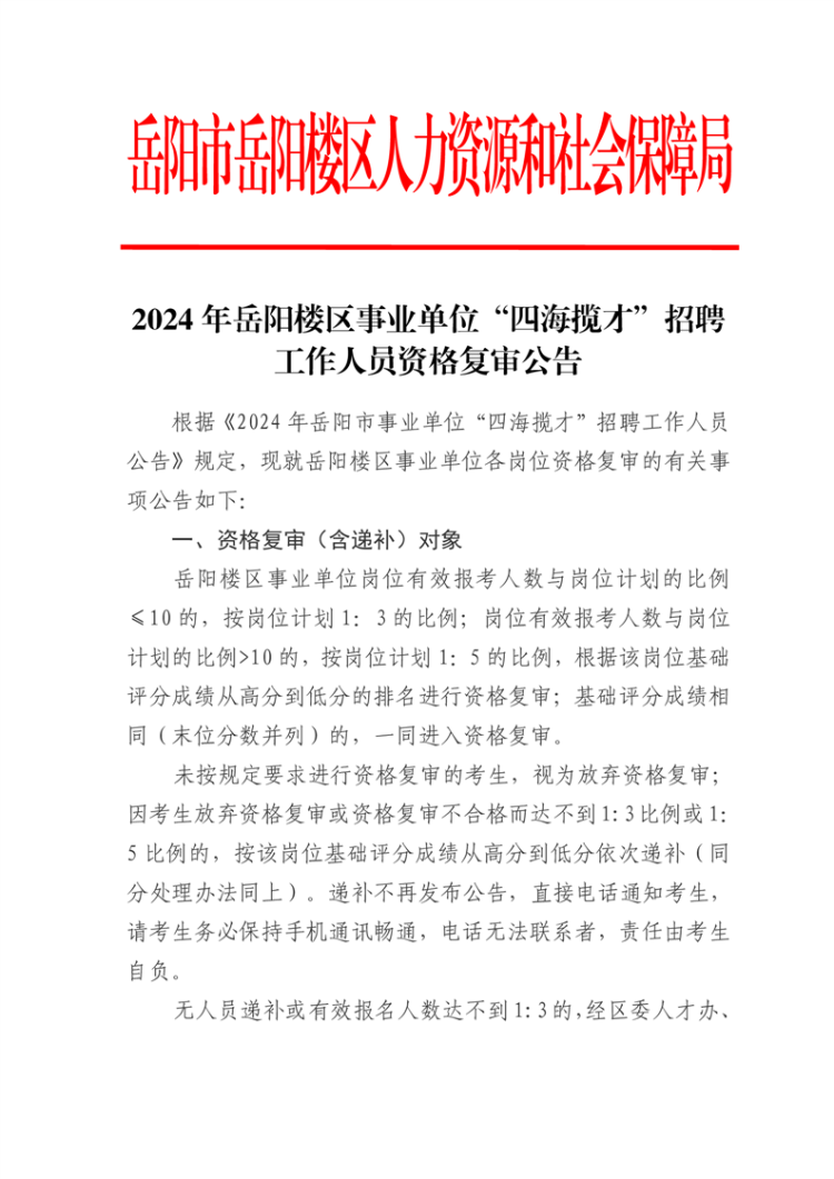 2024年岳阳楼区事业单位“四海揽才”招聘工作人员资格复审公告