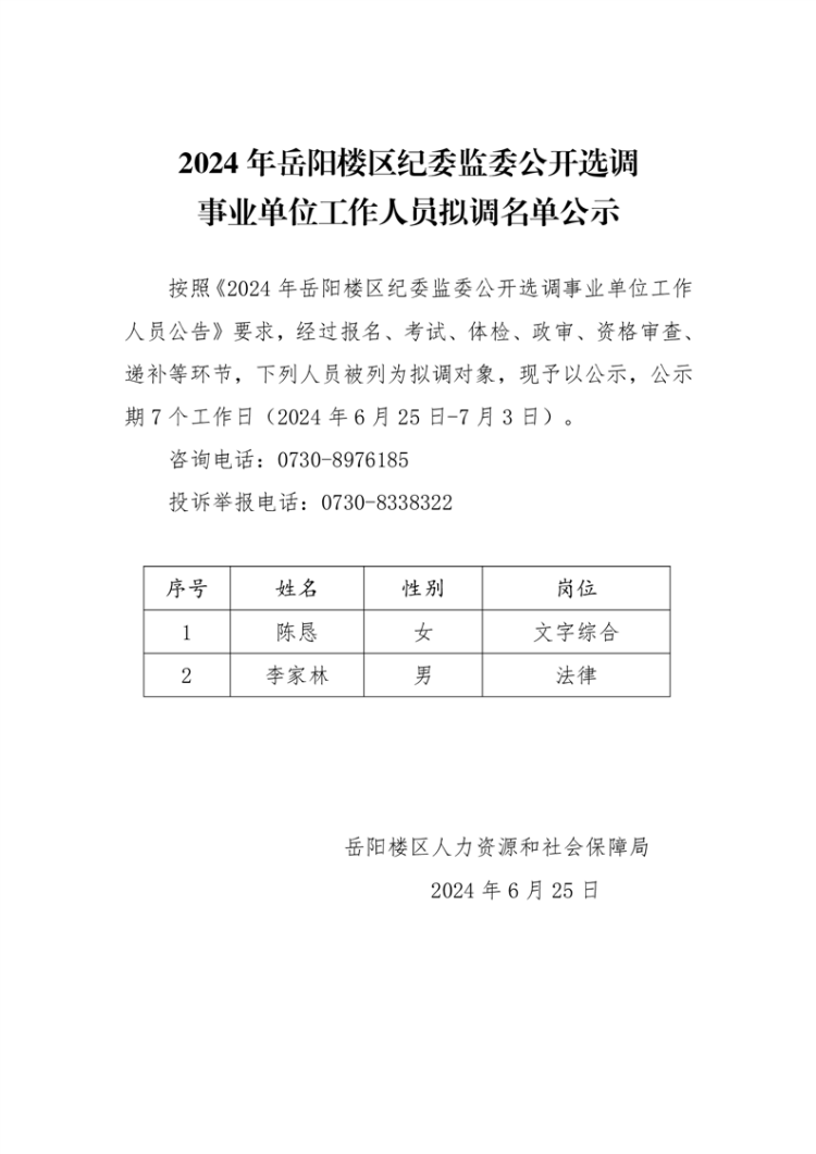 2024 年岳阳楼区纪委监委公开选调事业单位工作人员拟调名单公示