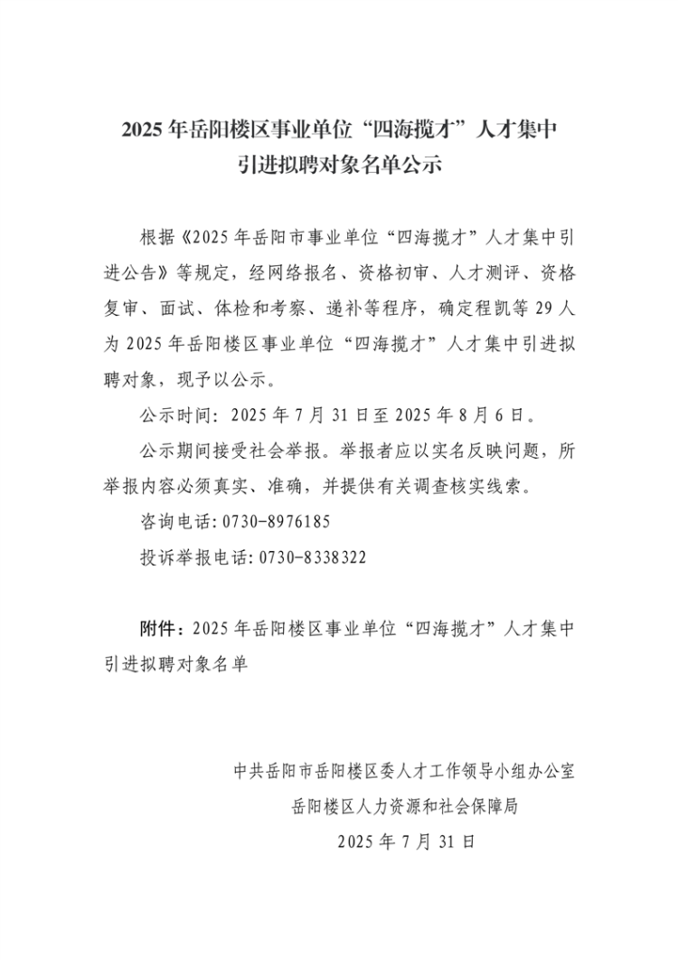 2025年岳阳楼区事业单位”四海揽才“人才集中引进拟聘对象名单公示