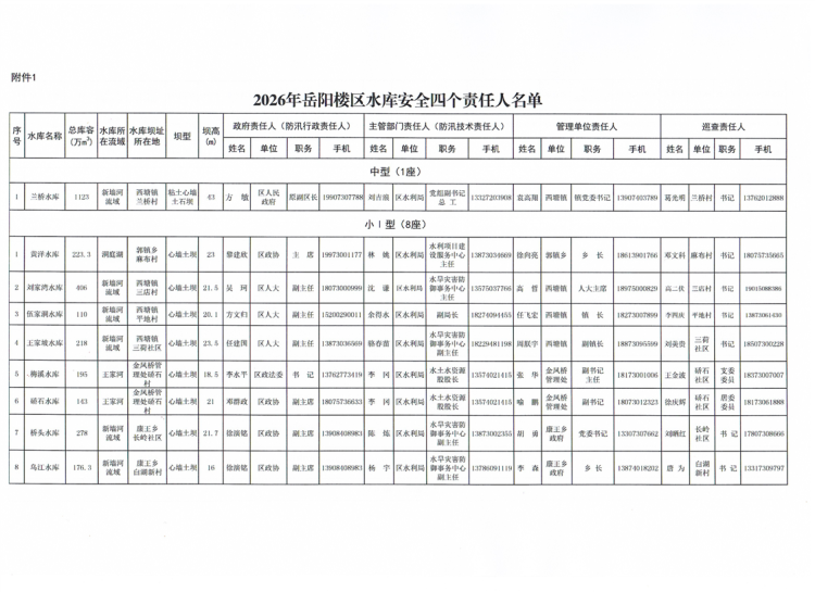 2026年岳阳楼区水库安全四个责任人和湖区堤垸防汛责任人名单