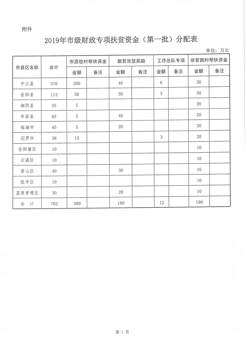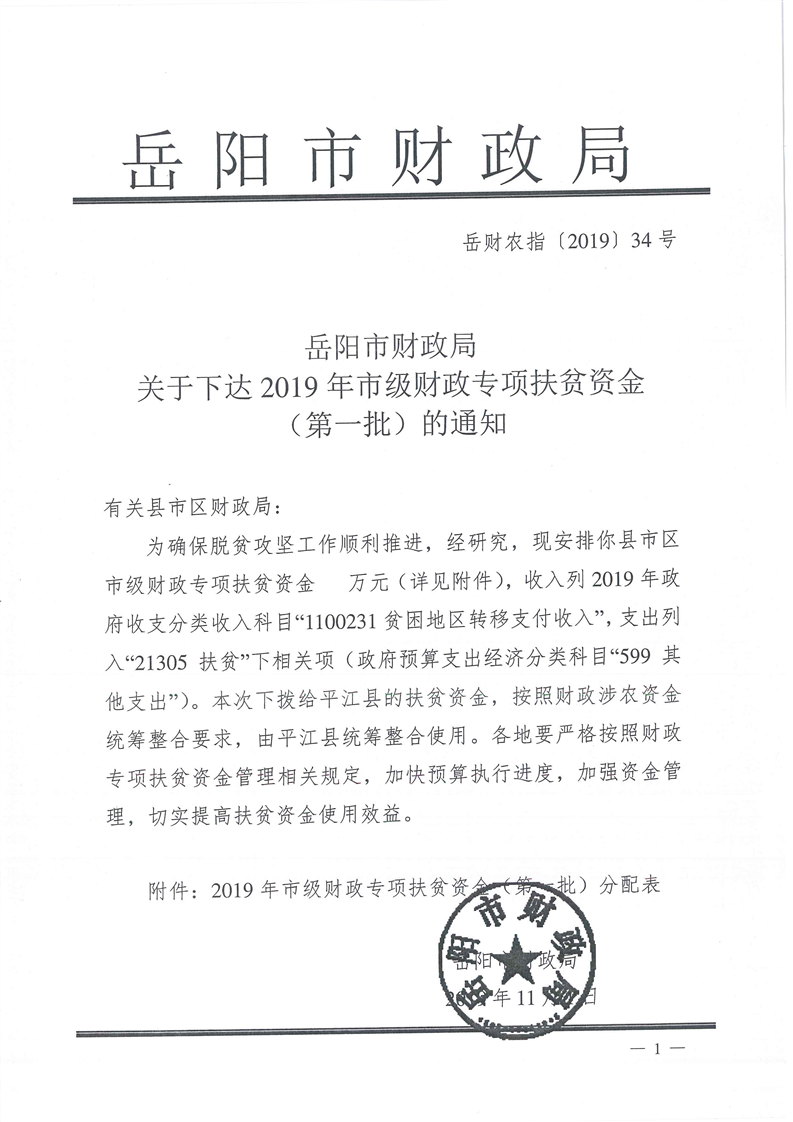 岳阳市财政局关于下达2019年市级财政专项扶贫资金(第一批)的通知