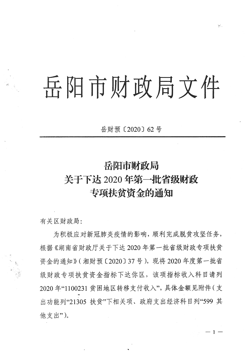 关于下达2020年第一批省级财政专项扶贫资金的通知