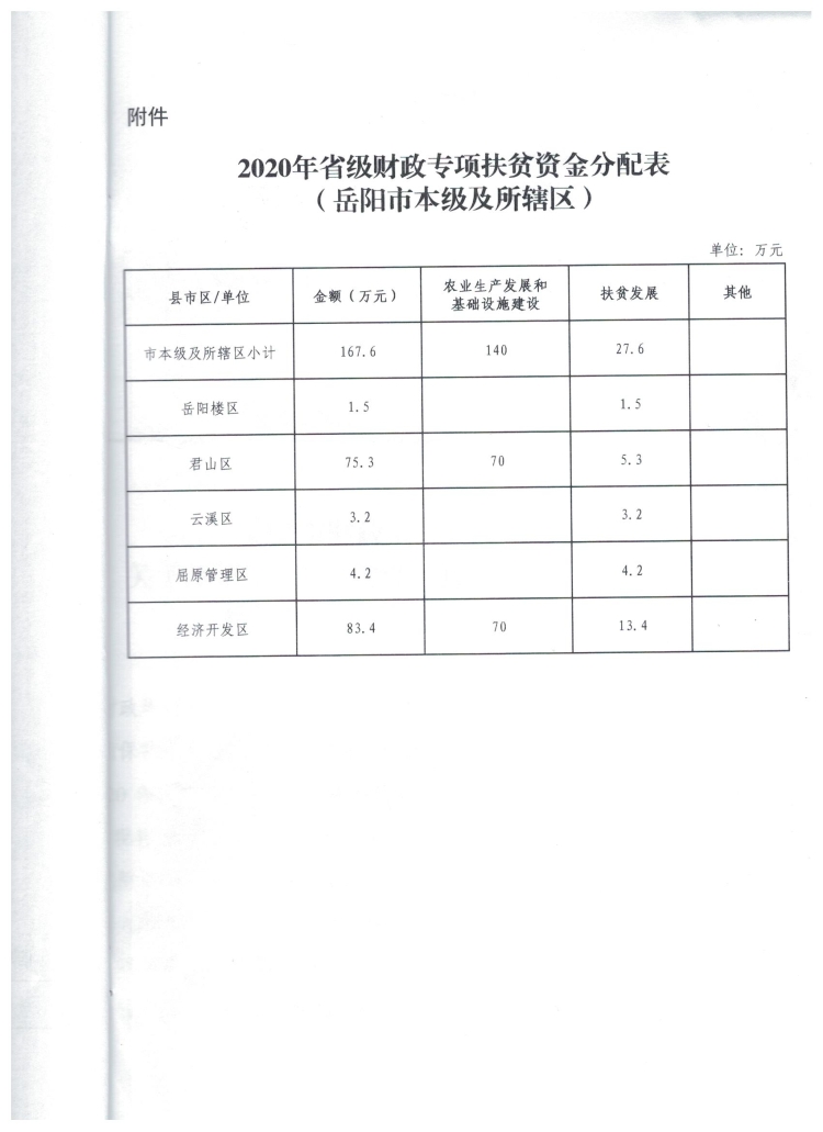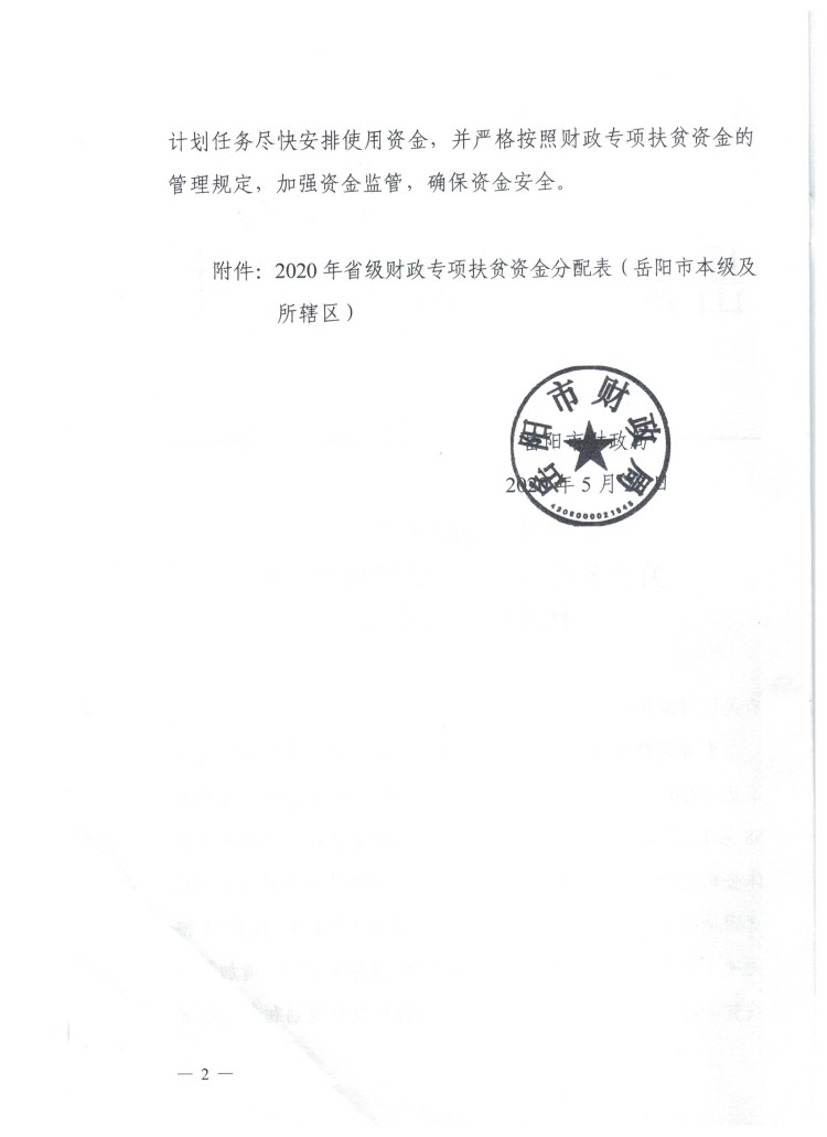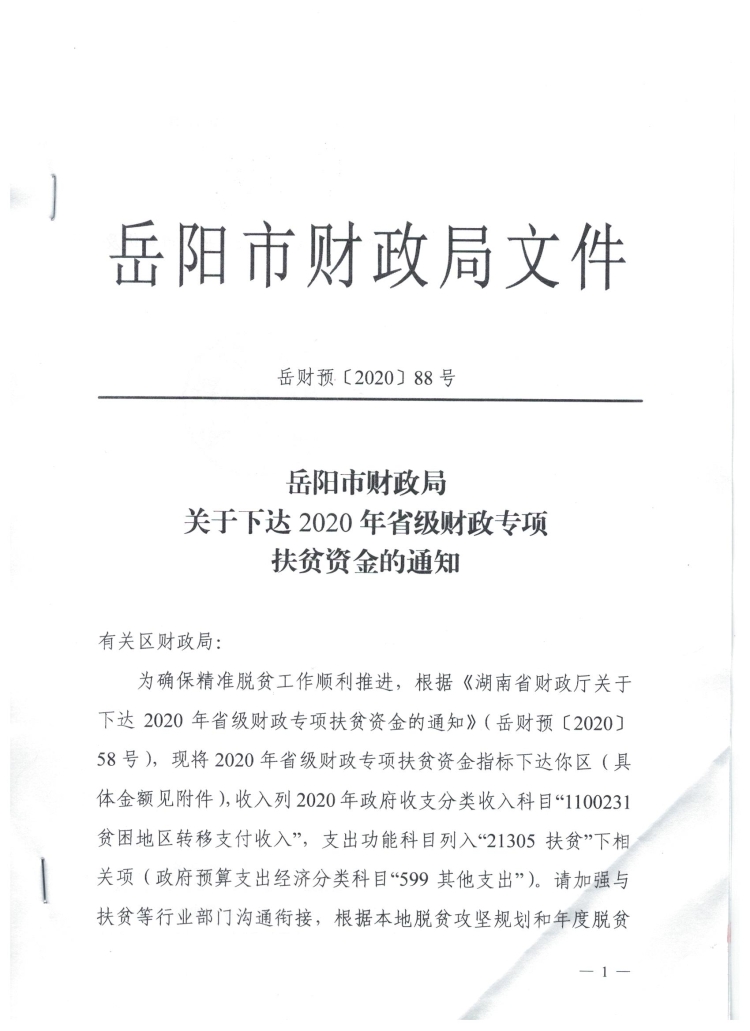 岳阳市财政局关于下达2020年省级财政专项扶贫资金的通知