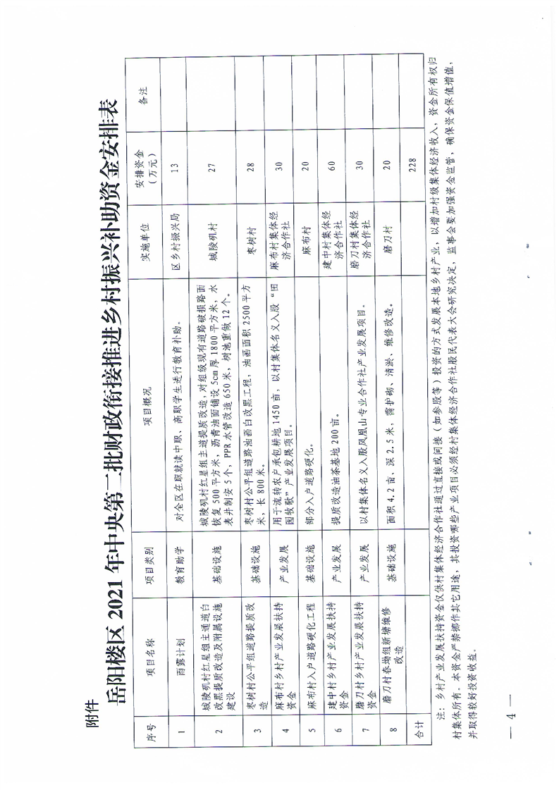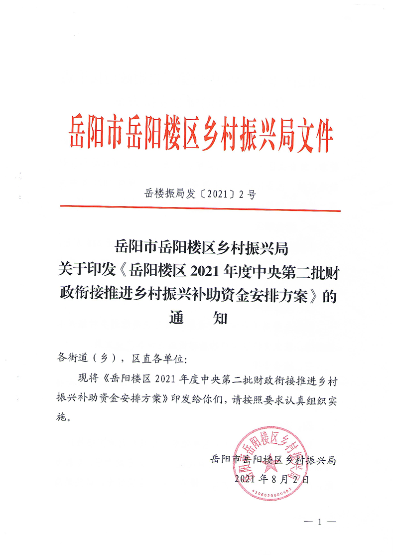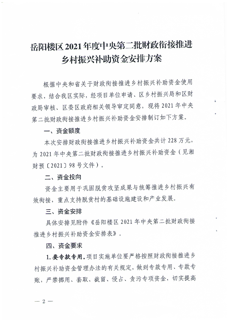 岳阳楼区2021年度中央第二批财政衔接推进乡村振兴补助资金安排方案