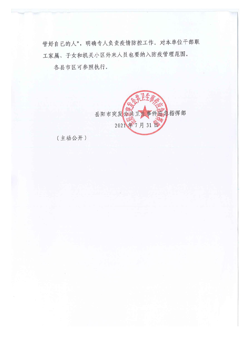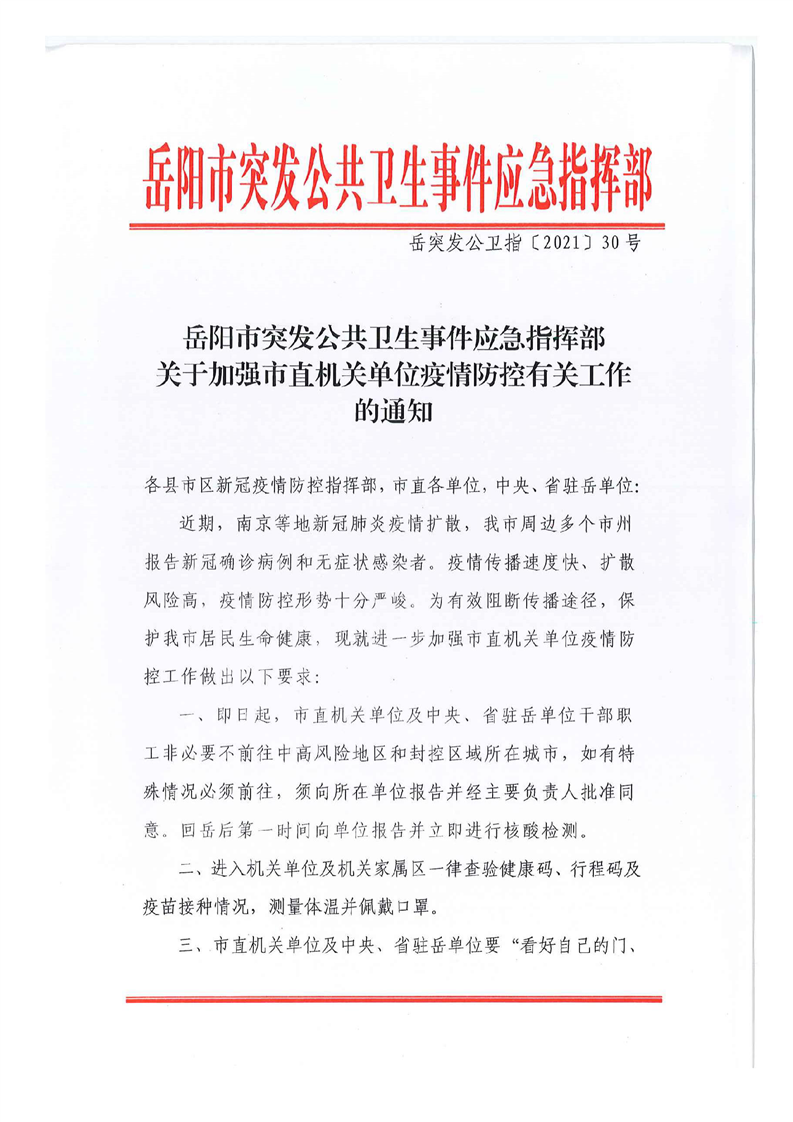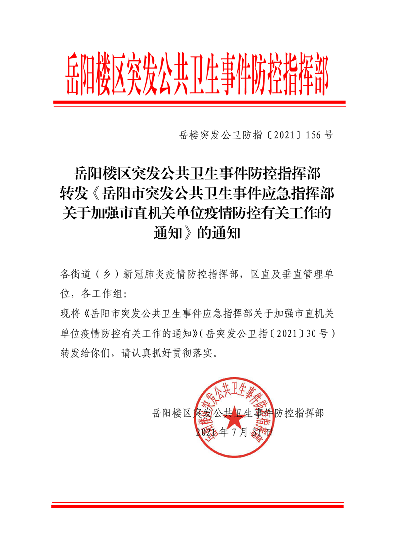 岳阳楼区突发公共卫生事件防控指挥部转发《岳阳市突发公共卫生事件应急指挥部关于加强市直机关单位疫情防控有关工作的通知》的通知