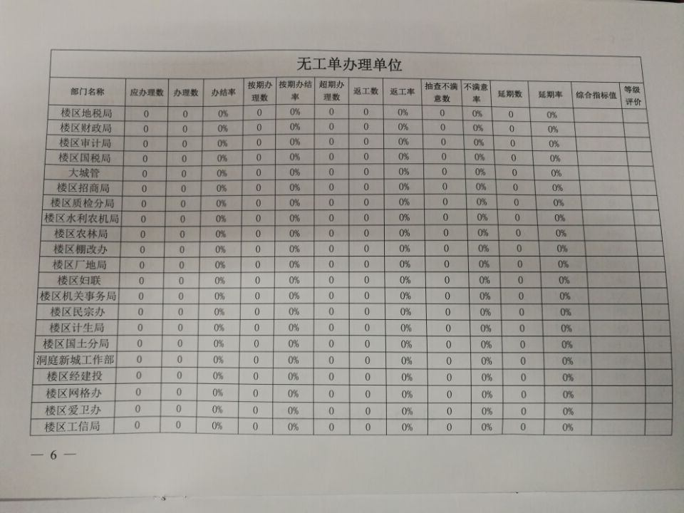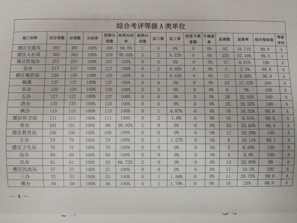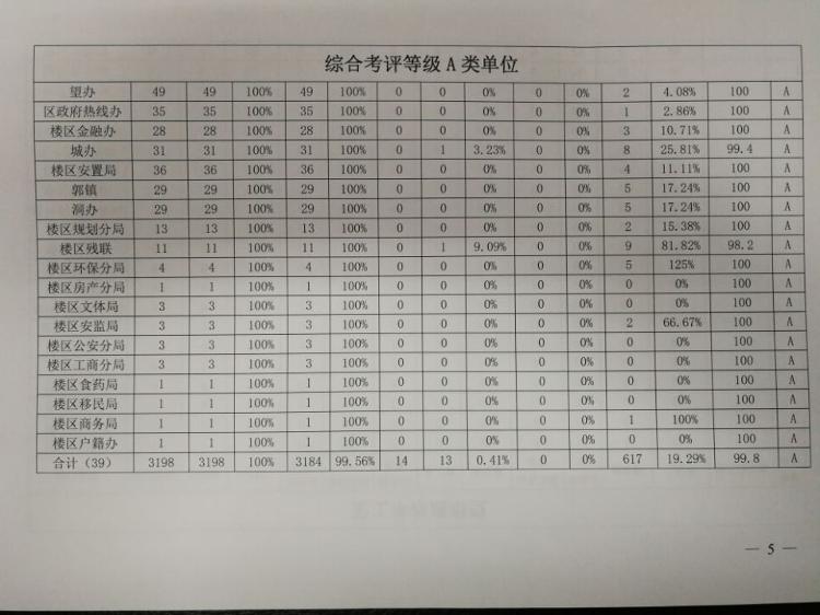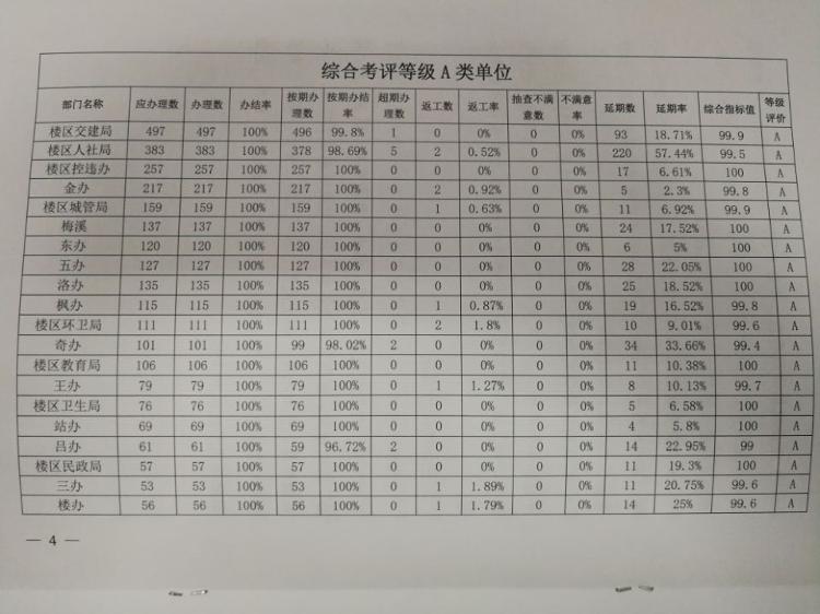 1.工单办理整体质量较高。第一季度,全区共受理12345公众服务热线工单3198件,综合考评等级为A类。60个工单承办单位中,综合考评等级为A类的单位39个,无工单办理任务的单位21个。其中综合考评为100分的单位有25家,特别是区控违办、服务港区工作组、东办、五办、洛办、区教育局、区卫计局、站办、区民政局、望办等单位克服工单量大的困难,确保了工单办理回复质量。