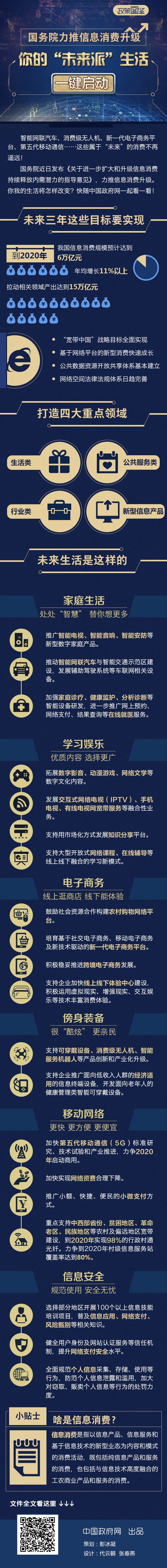国务院近日发布《关于进一步扩大和升级信息消费持续释放内需潜力的指导意见》,力推信息消费升级。你我的生活将怎样改变?快随中国政府网一起看一看!