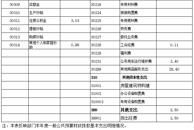 妇联2016年度财政拨款基本支出1134653.45元,其中工资福利支出488567.80元,其中:基本工资149002元、津贴补贴128970元、社会保障缴费114300元、其他工资福利支出81795.80元;商品和服务支出481114.65元,其中:办公费130817元、印刷费22036元、邮电费2235元、差旅费5555元、维修(护)费0元、租赁费0元、培训费0元、公务接待费11370.65元、公车运行及维护24000元、工会经费1100元、其他商品和服务支出284001元;对个人和家庭补助支出50621元,其中:退休3910元、住房公积金30300元、其他个人和家庭补助9780元。拨出经费25000元。
