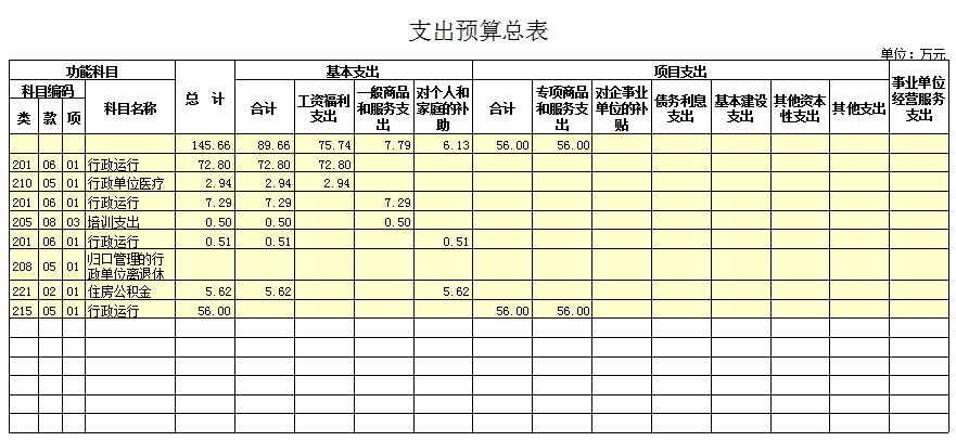 预算总支出145.66万元,其中:基本支出89.66万元(工资福利支出75.74万元、一般商品和服务支出7.79万元、对个人和家庭的补助支出6.13万元);项目支出56万元。