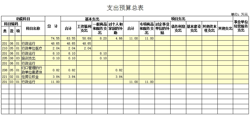 预算总支出74.55万元,其中:基本支出63.55万元(工资福利支出50.69万元、一般商品和服务支出8.2万元、对个人和家庭的补助支出4.66万元);项目支出11万元。