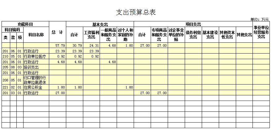 预算总支出57.79万元,其中:基本支出30.79万元(工资福利支出24.31万元、一般商品和服务支出4.68万元、对个人和家庭的补助支出1.8万元);项目支出27万元。