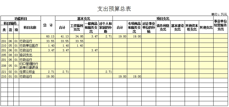 预算总支出60.13万元,其中:基本支出41.13万元(工资福利支出34.95万元、一般商品和服务支出3.47万元、对个人和家庭的补助支出2.71万元);项目支出19万元。