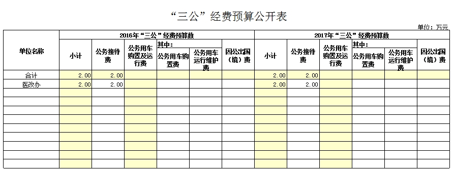 2016年的“三公”经费预算数2万元,主要为公务接待费2万元;2017年“三公”经费是2万元,主要为公务接待费2万元,与2016年持平。