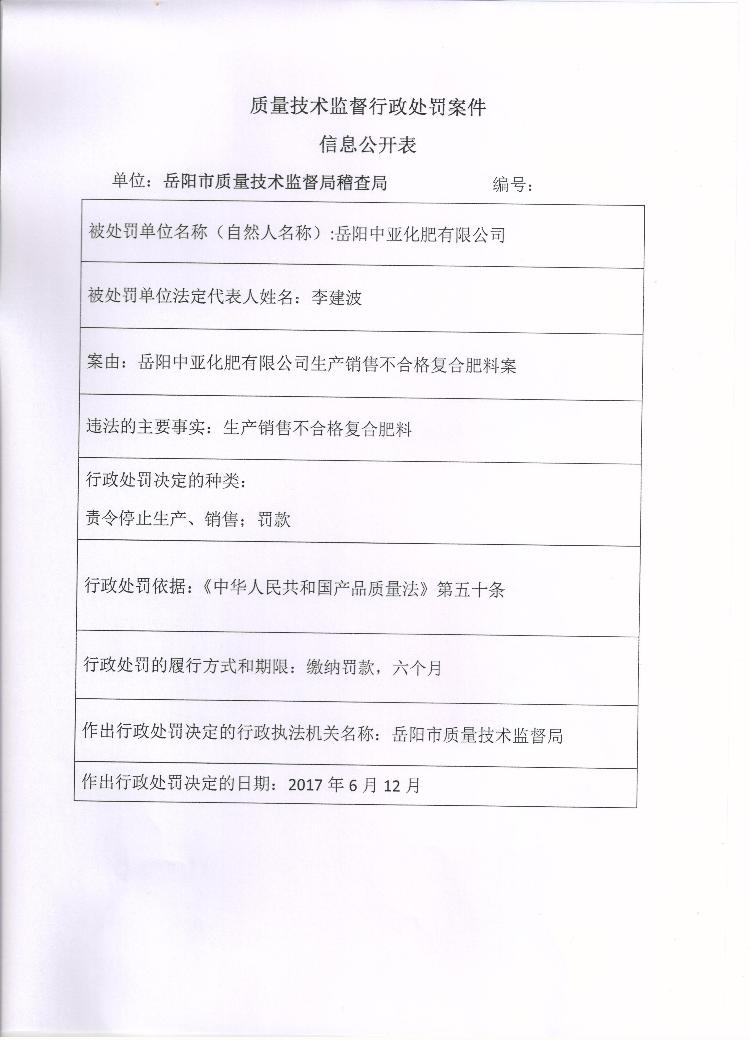 岳阳中亚化肥有限公司生产销售不合格复合肥料案