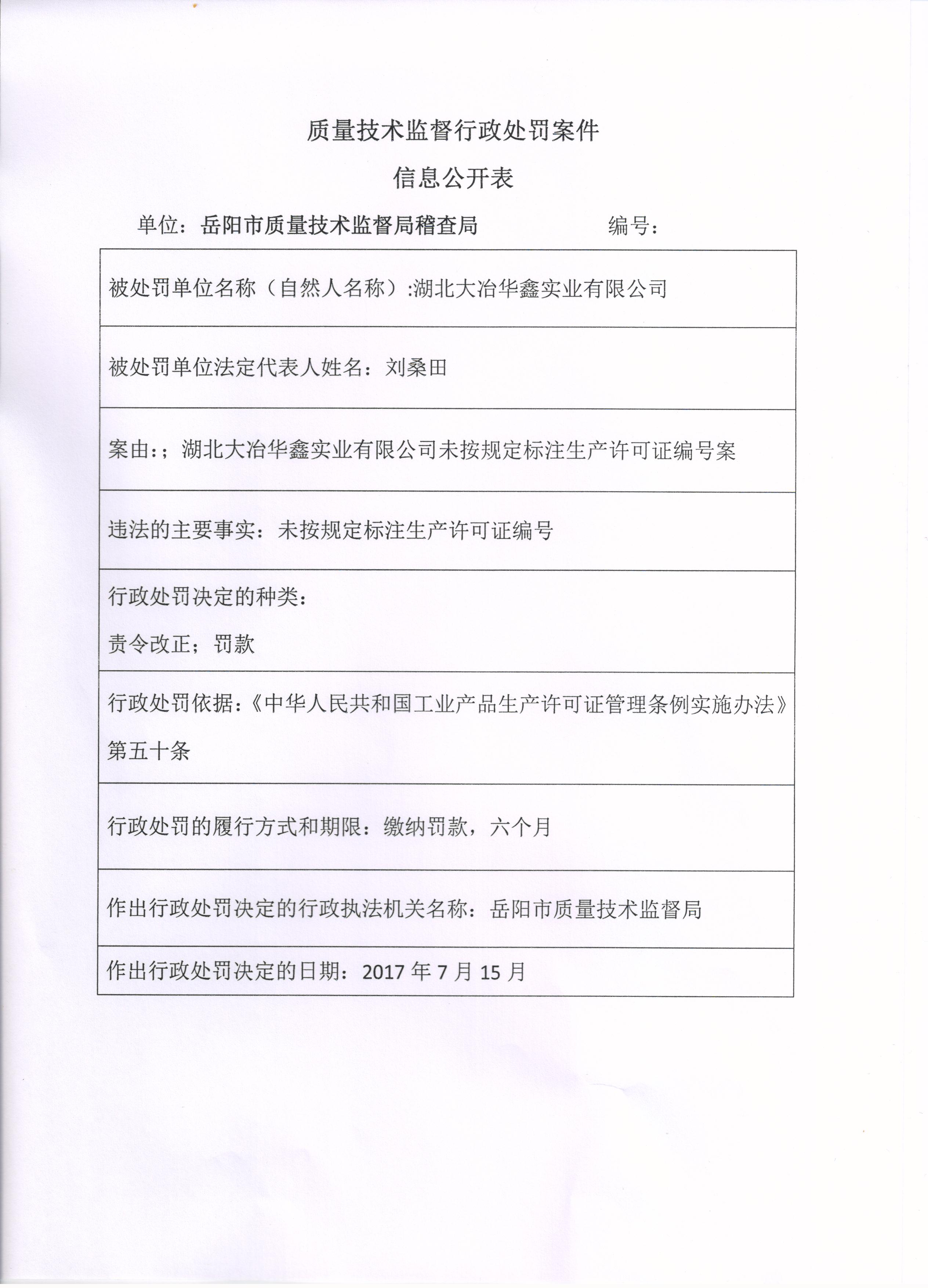 湖北大治华鑫实业有限公司未按规定标注生产许可证编号案