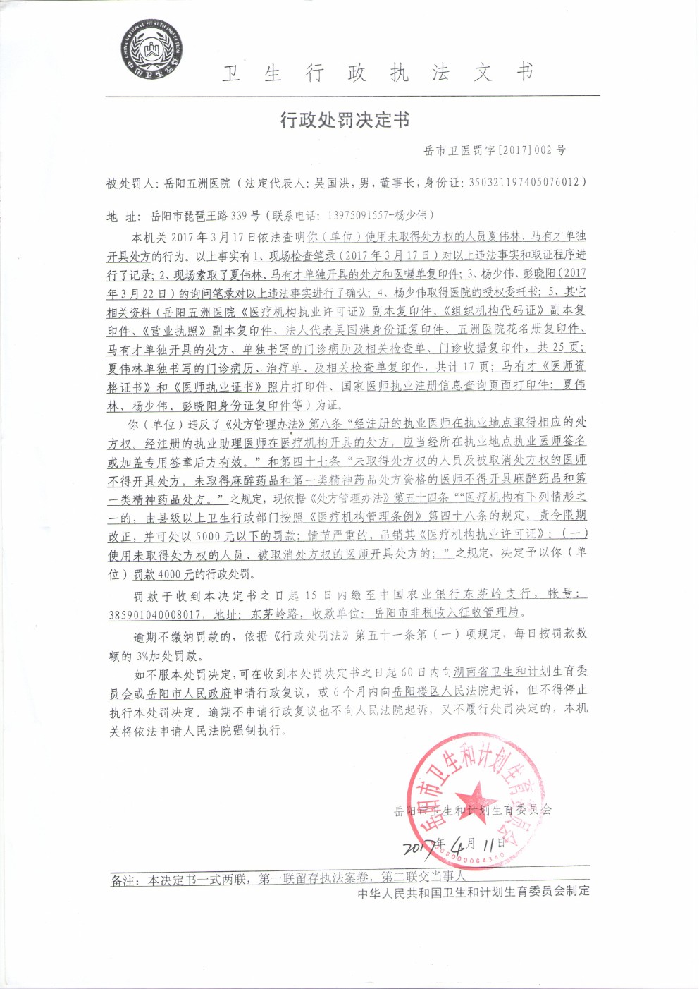 行政处罚决定书(岳市卫医罚字〔2017〕002号)