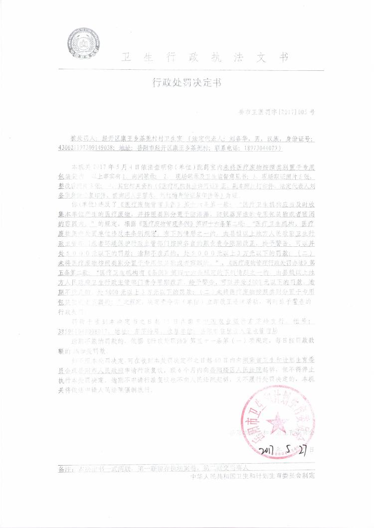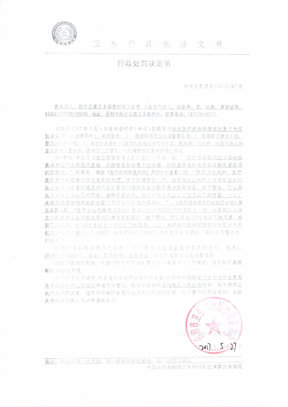 行政处罚决定书(岳市卫医罚字〔2017〕005号)
