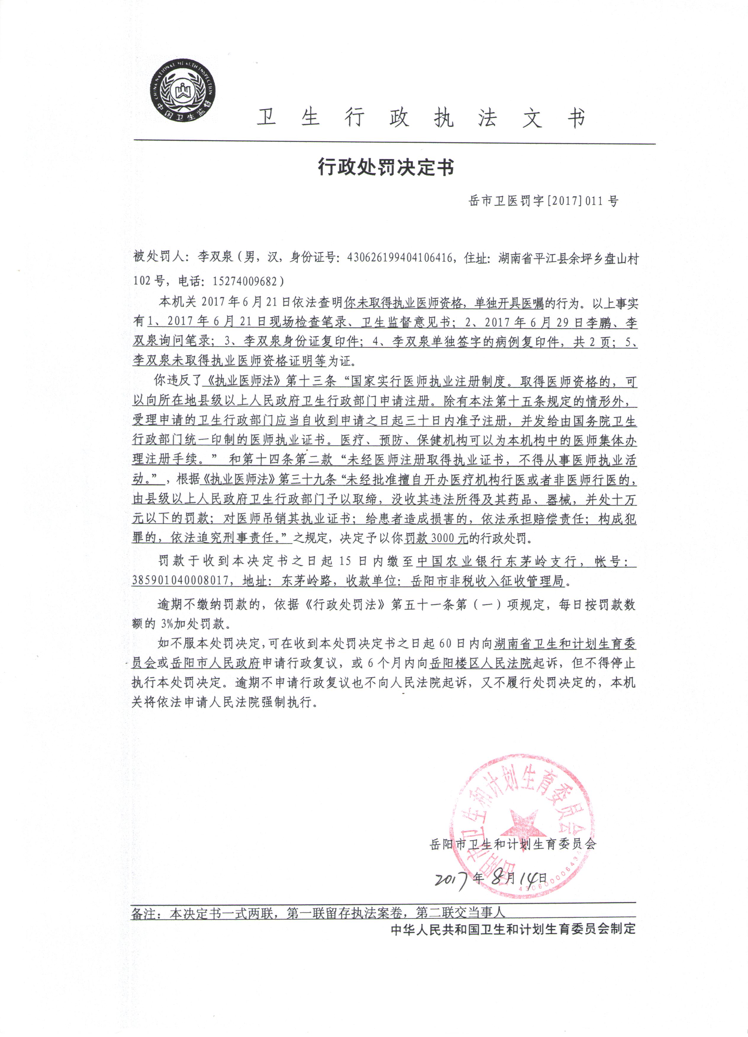 行政处罚决定书(岳市卫医罚字[2017]011号)