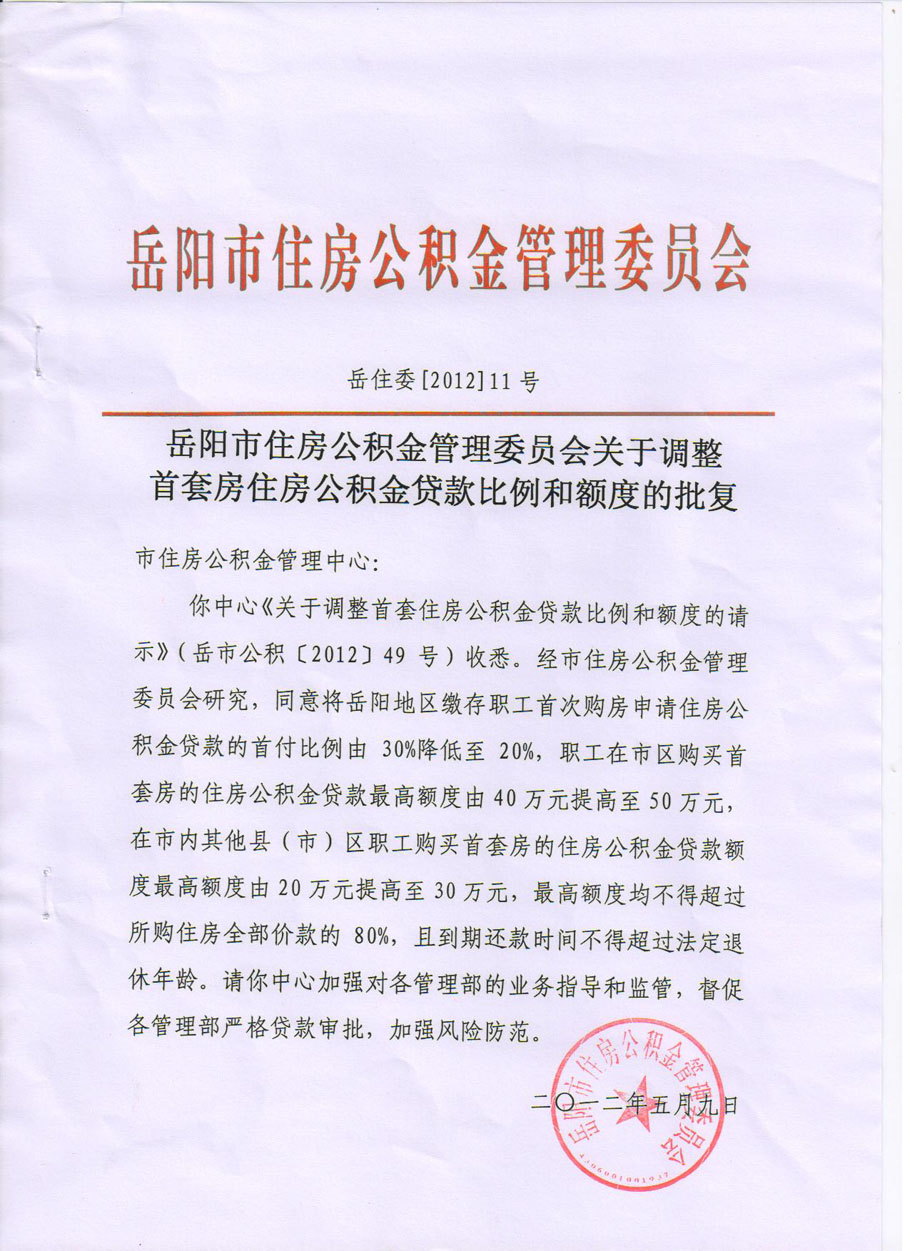 岳阳市住房公积金管理委员会关于调整首套房住房公积金贷款比例和额度的批复
