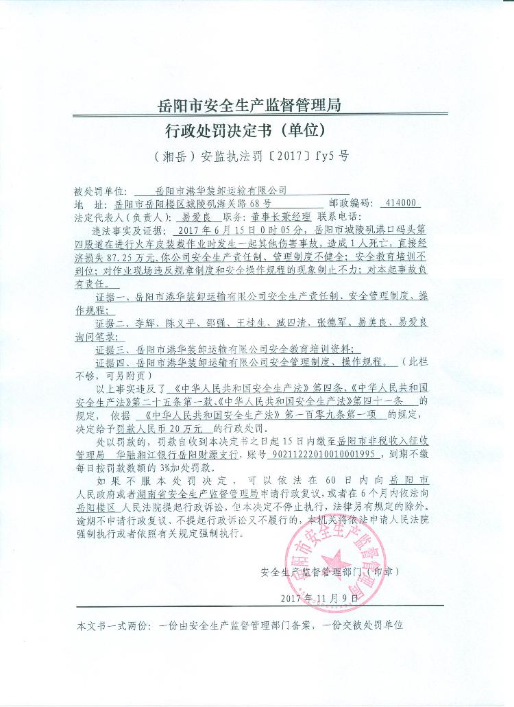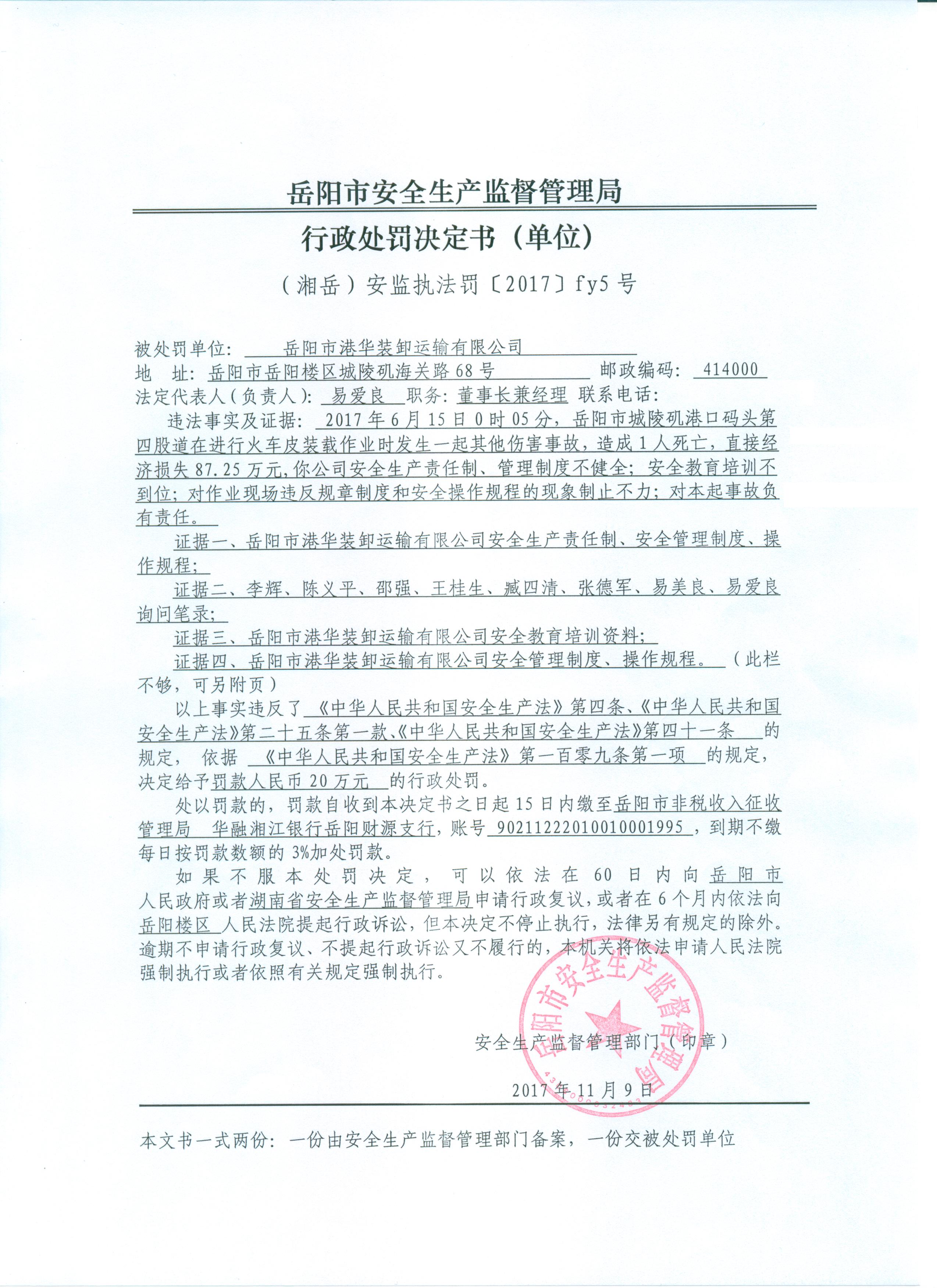 岳阳市港华装卸运输有限公司行政处罚决定书