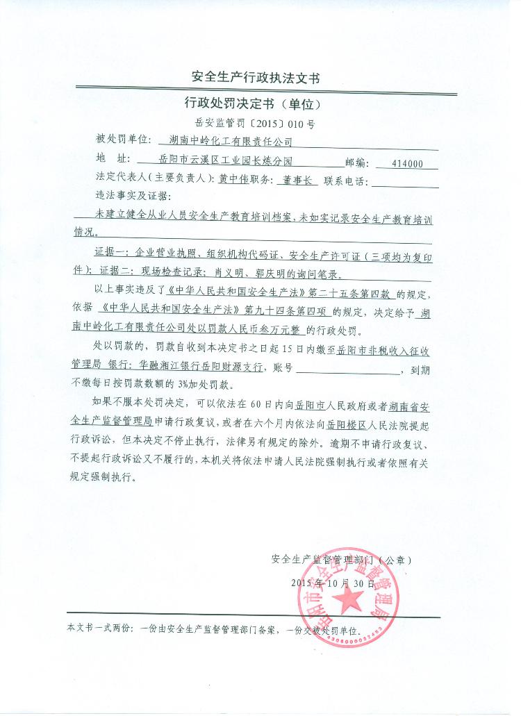 对湖南中岭化工有限责任公司给予行政处罚的决定