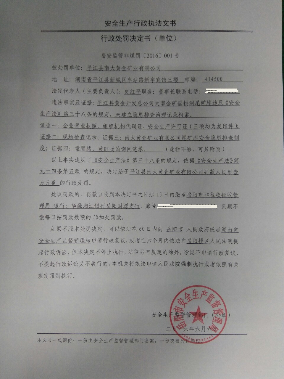 对平江县南大黄金矿业有限公司的行政处罚决定
