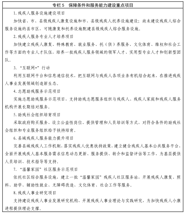 1.强化残疾预防、康复服务。实施残疾预防行动计划,强化基本公共卫生服务,建立综合性、社会化的新生儿出生缺陷、残疾儿童筛查、申报、预防和联合防治网络,形成信息准确、方法科学、管理完善、监控有效的残疾预防机制,提倡婚前检查和孕期检查,有效控制因遗传、疾病、意外伤害、生产事故、环境及其他因素导致的残疾发生和发展。建立残疾报告制度,加强信息收集、监测和研究,推动卫生计生部门与残联信息共享。建立残疾儿童康复救助制度。加强残疾预防宣传,广泛开展残疾预防"进社区、进校园、进家庭"宣传教育活动。以残疾儿童和持证残疾人为重点,采取多种形式,实施精准康复,为残疾人提供基本康复服务。加大残疾儿童康复救助力度,逐步实现视力、听力、言语、智力、肢体残疾儿童和孤独症儿童免费得到手术治疗、辅助器具配置和康复训练等服务。鼓励有条件的地方对进入康复机构接受训练的贫困残疾儿童及其家庭给予适当的住宿、交通、生活等补助。实施重点康复项目,为城乡贫困残疾人、重度残疾人提供基本康复服务。建立医疗机构与残疾人专业康复机构双向转诊制度,实现分层级医疗、分阶段康复。依托专业康复机构指导社区和家庭为残疾人实施专业化的康复服务,将残疾人社区医疗康复纳入城乡基层医疗卫生机构考核内容。加强各级康复机构规范化建设和人才培养。