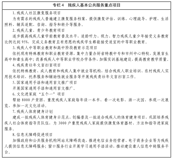 3.丰富残疾人文化体育生活。按照文化体育均等化服务的要求,将残疾人文化、体育需求纳入地方公共文化体育设施与服务平台规划建设,为残疾人提供无障碍设施及无障碍服务,公共文化体育设施和公园等公共场所对残疾人免费或优惠开放,各级公共文化设施要为残疾人配备无障碍设施。有条件的公共图书馆要设立盲人阅览室或盲人阅览区,配置盲文读物及相关设备。开展残疾人文化周、残疾人阅读推广等群众性文化活动,公共文化惠民工程、全民健身工程、全民阅读工程、公共文化体育服务机构和基层综合性文化服务中心要提供适合残疾人的服务内容和活动项目。加强特殊艺术人才培养,培育残疾人文化艺术品牌。实施"残疾人体育健身计划",推动残疾人康复体育和健身体育广泛开展,推动残疾人体育进社区、进家庭。加强特教学校体育教学和课外体育锻炼。促进残奥、特奥、聋奥运动均衡发展。加强残疾人运动员队伍培养、管理、教育和保障,提高残疾人体育竞技水平,力争在国际国内赛事中再创佳绩。