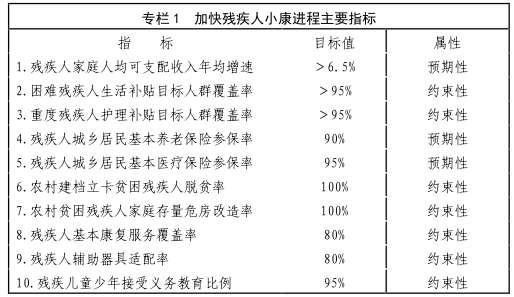 (三)主要目标。到2020年,残疾人权益保障制度基本健全,基本公共服务体系更加完善,残疾人事业与经济社会协调发展;残疾人社会保障和基本公共服务水平明显提高,残疾人融合发展得到大力推进,广大残疾人生活更加殷实、更加幸福、更有尊严。