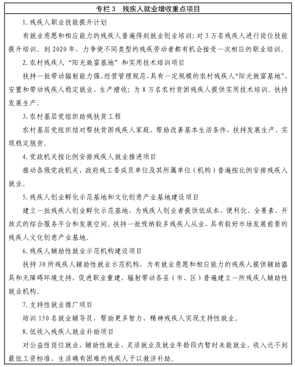 3.大力支持残疾人多种形式就业增收。对有劳动能力的残疾人进行职业技能和实用技术培训,增强就业能力。认真落实国家对残疾人创办的小微企业和社会组织的扶持政策,并为其提供孵化服务。各级政府开发的公益性岗位,优先安排符合就业困难人员条件的残疾人就业。鼓励有条件的地方将乡镇(街道)、村(社区)残疾人专职委员纳入政府购买社会公共服务范畴。对残疾人兴办、创办、领办安置残疾人就业单位的,在场地、资金、技术、贴息贷款等方面予以支持。政府在城镇临街小巷巷口划定专门地块,设置残疾人就业摊点,帮助残疾人自力更生从事经营活动。支持发展残疾人家庭手工业,建立完善残疾人家庭手工业服务体系,开辟残疾人居家就业渠道。借助"互联网+"行动,鼓励残疾人利用网络就业创业,给予设施设备和网络资费补助。加大对残疾人扶贫的信贷支持力度。对满足融资增信措施到位、信贷风险可控和符合商业银行信贷政策等条件的贫困残疾人贷款,可在信用登记评定、贷款额度等方面给予一定倾斜。以残疾人福利基金会为依托,建立残疾人创业基金,解决有创业意愿和创业能力的残疾人筹措创业资金难题。每个县市区至少建有一所辅助性就业机构。为辅助性就业残疾人提供工资性补贴和社会保险补贴,对辅助性就业机构设施设备、无障碍改造等给予补助。扶持残疾人亲属就业创业,实现零就业残疾人家庭至少有一人就业。