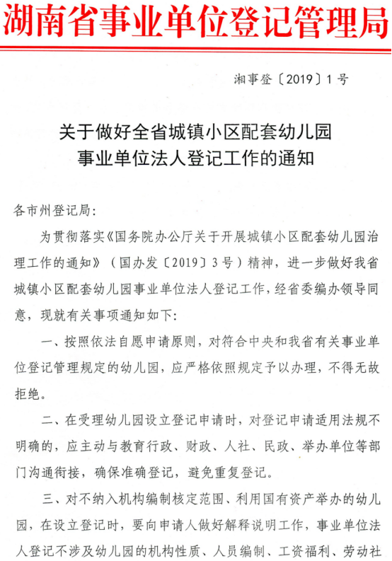 关于做好全省城镇小区配套幼儿园事业单位法人登记工作的通知