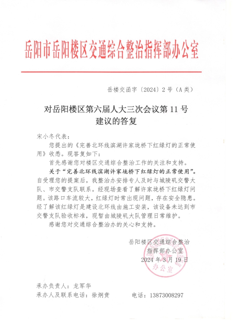 对岳阳楼区第六届人大二次会议第11号建议的答复