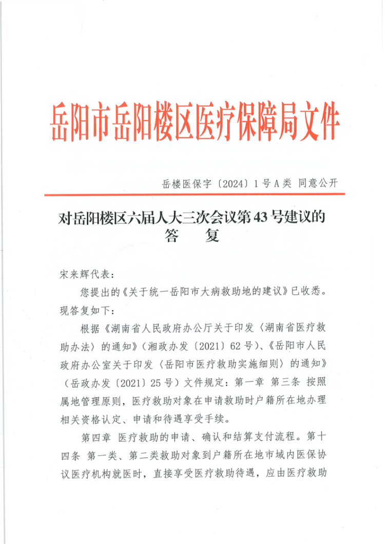 对岳阳楼区六届人大三次会议第43号建议的答复