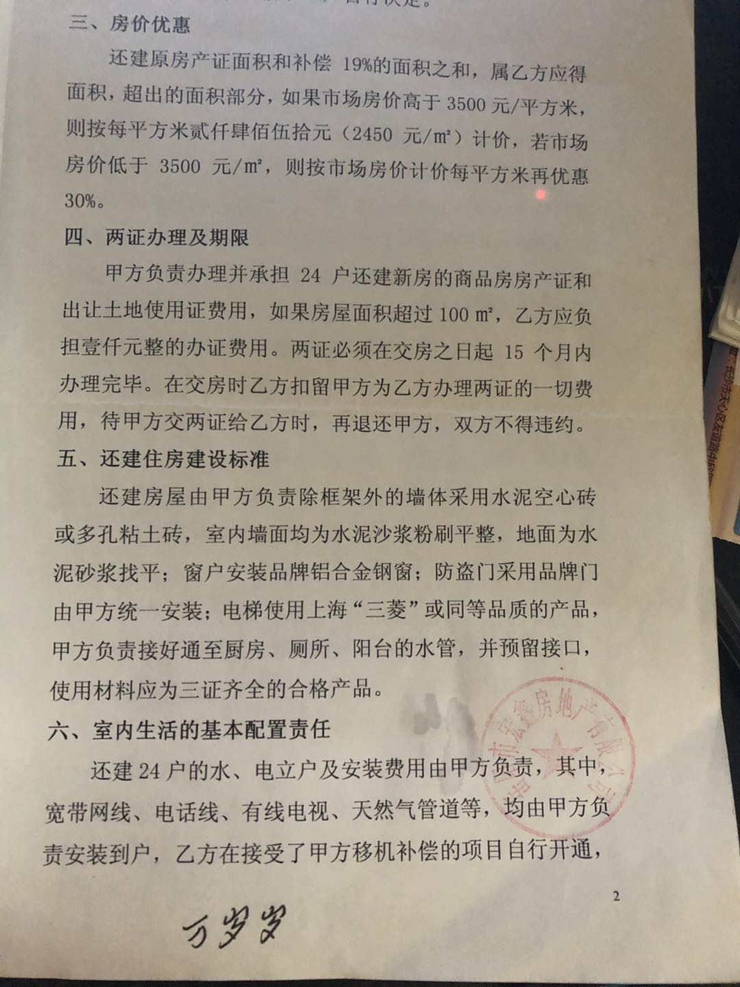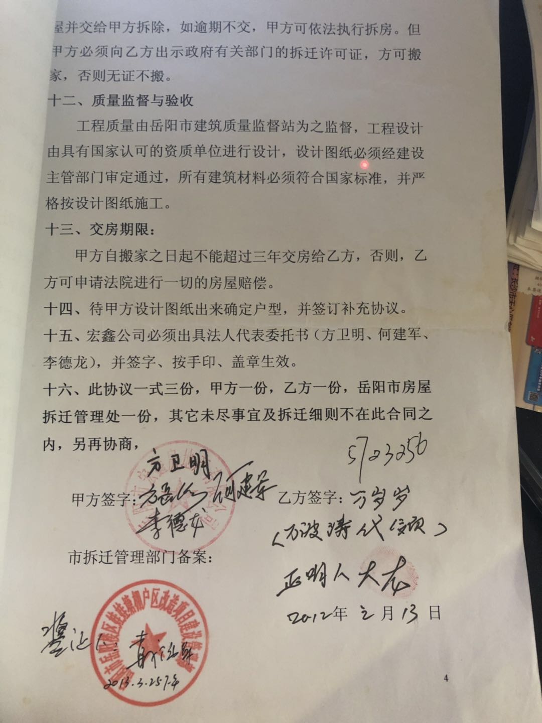 尊敬的局长大人及部门工作人员 你们好!我是原岳阳市楼区东井岭小区六层楼业主,在2012年11月15日,岳阳市楼区征收安置工作局对我们下发了棚户区改造通知。由岳阳宏鑫房地产有限公司进行拆迁改造,并签订了拆旧还建合同。 合同上明确表明了宏鑫房地产有限公司自交房之日起15个月内为还建业主负责并承担两证办理费用。我于2017年2月向其支付了办证费但时至今日已一年有于,从未见得房产证半点影子,而且每每联系开发商总是一句正在办理草草了事。 出于担心我在今年3月去往房产局查询,得知我名下并未有关于宏鑫的房产信息,显示开发商并未配合办理相关网签,合格总证也没办理,房产证更是遥遥无期了。 开发商此做法明显有悖法律,苦于自身势单力薄,求助无门。只能求助政府,希望政府能给普通公民的我一个满意的答复。 我的诉求:宏鑫房地产有限公司依法按规为我办理网签、合格证房产证。不是口头承诺,落实行动上。违约期限按规定进行赔偿。 |