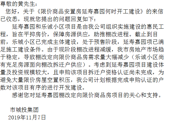 尊敬的市领导: 你好! 位于长动公司后面已规划的延寿家园限价安置商品房小区已公示较长时间,一直 还未见开工建设,但部分棚改拆迁户还在等此小区建设好, 能尽快搬进新居所,改善自己的人居环境。请问此小区何时能启动开工建设,建设工期规划多长?盼望相关部门回复。谢谢! |