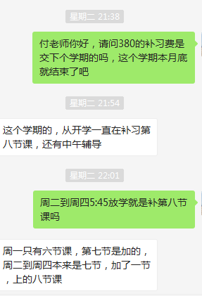 五里中学仅七年级学生从9月份开学起周二到周四就在上第八节课,到了11月底班主任开家长会才突然要交380元一学期的补习费用,让家长填是否同意补习,家长填的不同意,可是在学校班主任让没有交费的同学去办公室,说要交380元的补习费用,之后在微信问班主任,班主任说从开学就一直在补课了(老师都这么说了,所以就先交了380的补习费)。而且下个学期还要继续交。请问学校这样收补课费用是否合理? |
