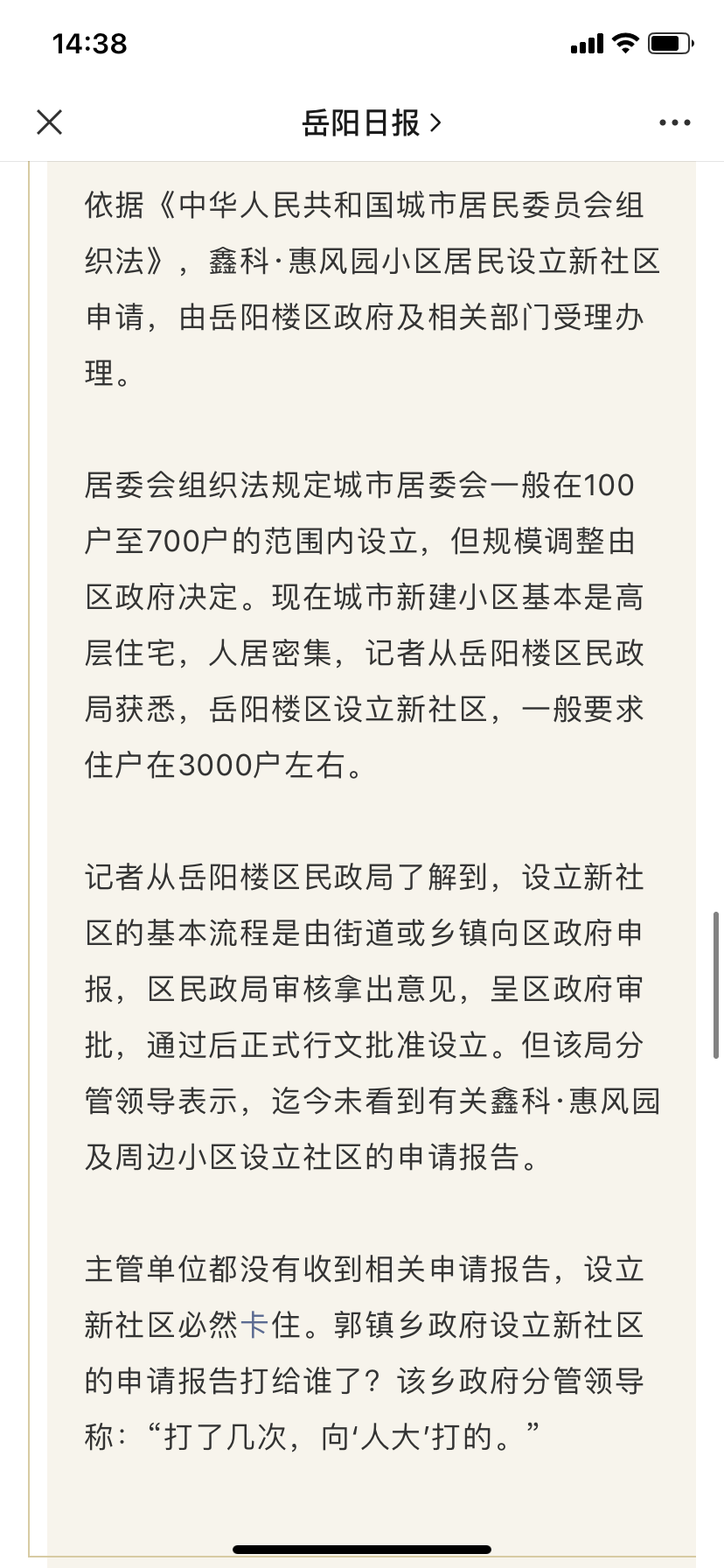 | 回复内容: | 关于市长信箱的回复: 经核实:领导很重视鑫科惠风园小区社区成立这事,上周分管副区长召开了专题办公会,郭镇乡街道办事处现正着手把小区住户录入网格系统,进行管理。 郭镇乡街道办事处 2020年12月7日 |
