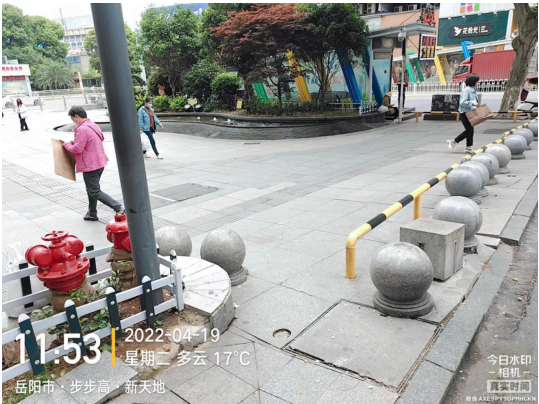 曾市民您好! 关于4月17日您反映步行街步步高前人行道止车石占道情况的留言收悉。岳阳市人民政府12345热线服务中心将来信转交至岳阳市城市管理综合行政执法支队直属三大队调查处理,现就有关办理情况回复如下: 我大队执法队员已到步步高前坪查看,止车石和栏杆的情况确实存在,我部门已上门步步高物业,据了解是因为步步高前坪人流量大,为防止摩托车乱窜至人行道上,现已要求物业负责人将石球移开,留出路口供行人通行。物业配合。 我大队将继续跟进,确保您反映的问题落实尽快落实到位。 岳阳市城市管理综合行政执法支队直属三大队 2022年4月20日 附件:执法队员现场劝导照片