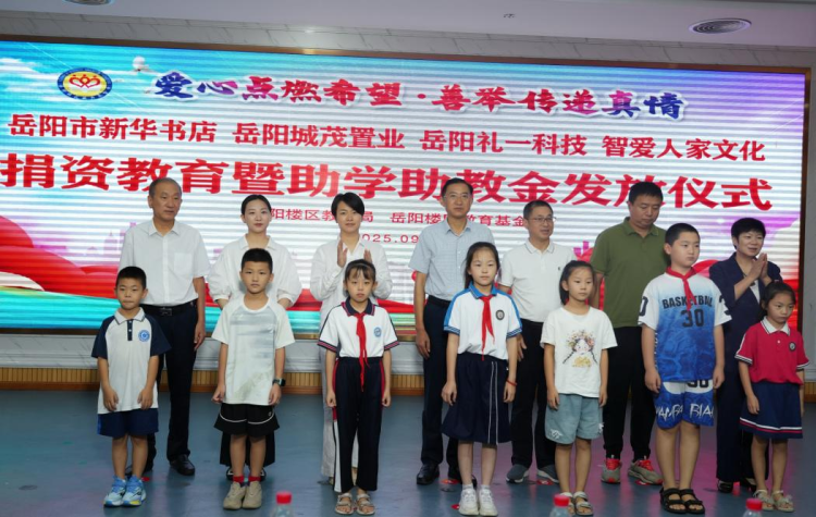 仪式上,岳阳市新华书店、岳阳城茂置业有限公司、岳阳礼一科技股份有限公司、湖南智爱人家文化发展有限公司四家企业现场举牌认捐,总额达130万元,持续助力我区教育事业发展。邓建华为四家企业颁授荣誉牌匾,表彰其热心教育、回馈社会的善举和深厚情怀。现场为85名家庭困难学生和60名教师发放资助金40万元,切实缓解师生实际困难,传递社会温暖与关怀。