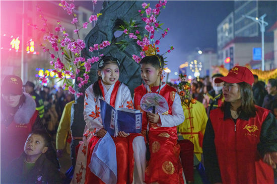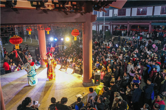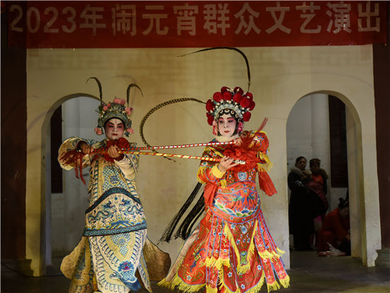 2月5日晚上,永州市蓝山县塔下寺文化广场,戏曲文艺志愿者为市民表演了非物质文化遗产祁剧经典剧目。