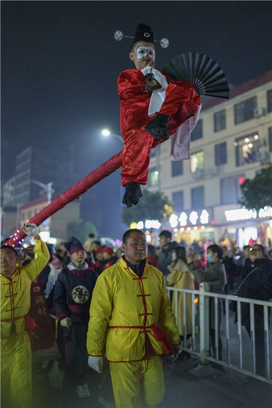 2月4日,汨罗市长乐镇故事巡演中的高跷表演。黄松柏摄