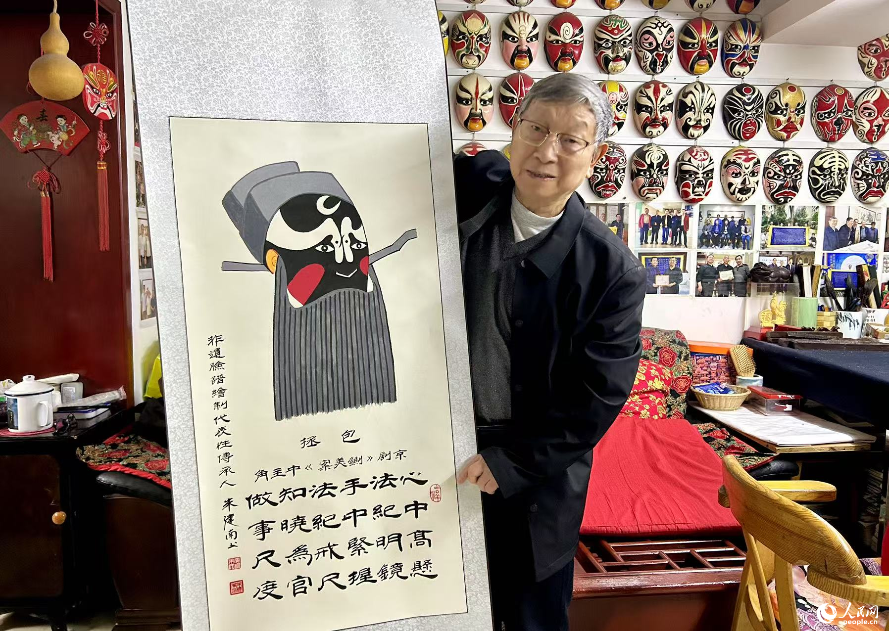 朱建南与他的《包拯脸谱系列作品》(其一)。人民网 刘汕摄