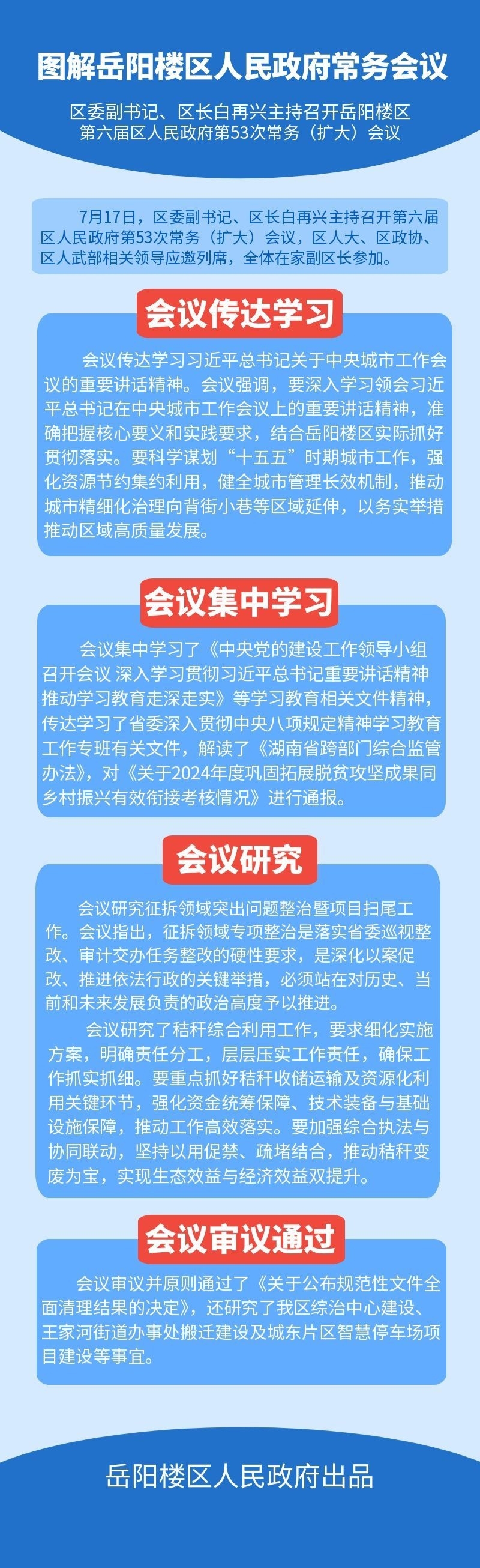会议传达学习习近平总书记关于中央城市工作会议的重要讲话精神。会议强调,要深入学习领会习近平总书记在中央城市工作会议上的重要讲话精神,准确把握核心要义和实践要求,结合岳阳楼区实际抓好贯彻落实。要科学谋划“十五五”时期城市工作,强化资源节约集约利用,健全城市管理长效机制,推动城市精细化治理向背街小巷等区域延伸,以务实举措推动区域高质量发展。