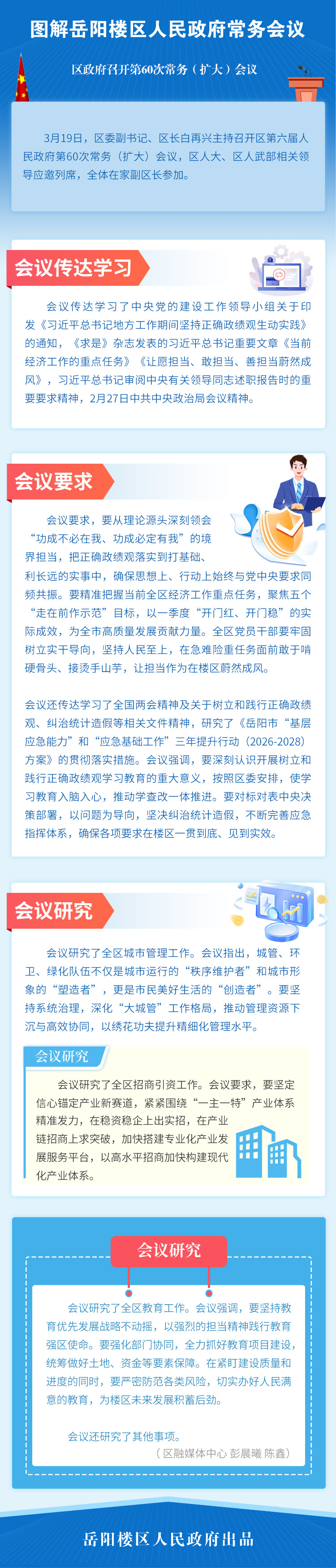 会议还传达学习了全国两会精神及关于树立和践行正确政绩观、纠治统计造假等相关文件精神,研究了《岳阳市“基层应急能力”和“应急基础工作”三年提升行动(2026-2028)方案》的贯彻落实措施。会议强调,要深刻认识开展树立和践行正确政绩观学习教育的重大意义,按照区委安排,使学习教育入脑入心,推动学查改一体推进。要对标对表中央决策部署,以问题为导向,坚决纠治统计造假,不断完善应急指挥体系,确保各项要求在楼区一贯到底、见到实效。