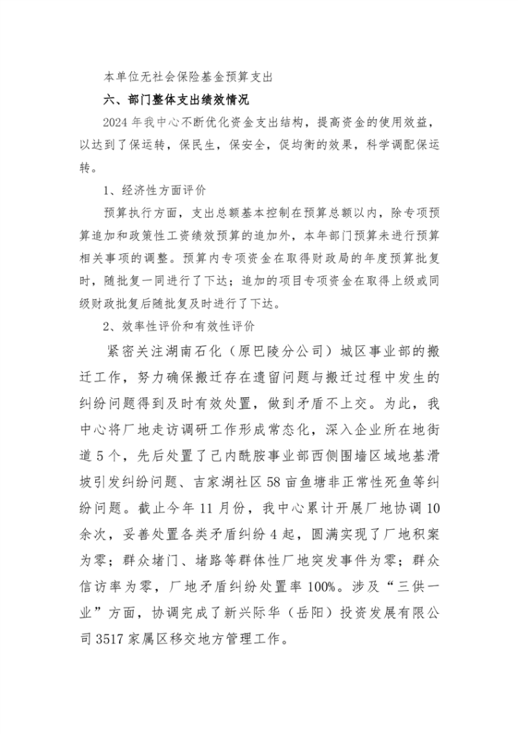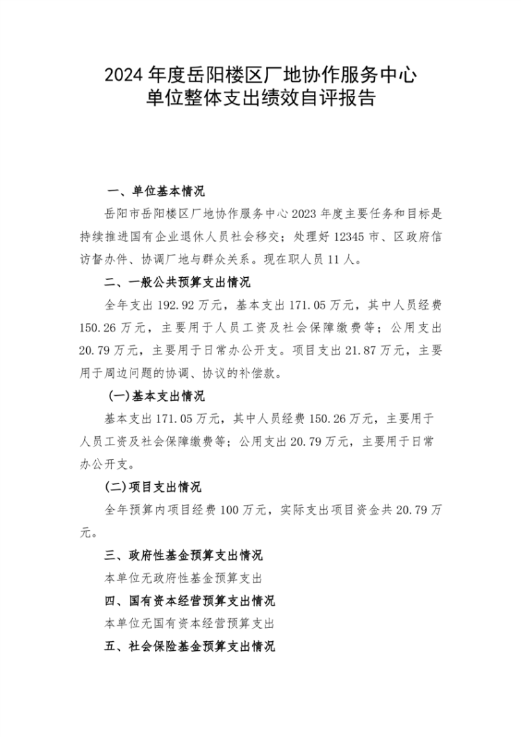 岳阳楼区厂地协作服务中心2024年单位整体支出绩效自评